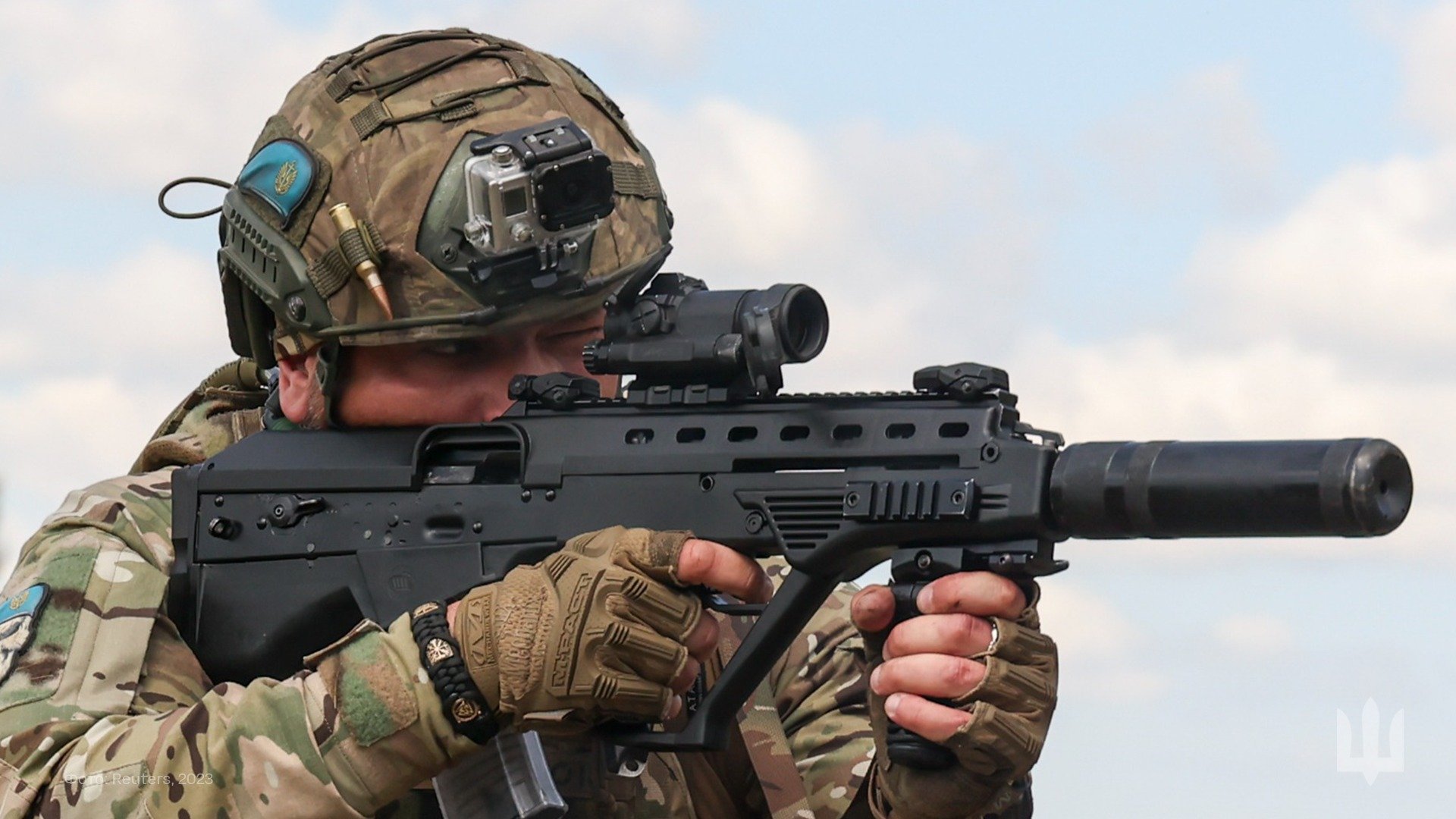 Aktuální fotka ukrajinského vojáka s útočnou puškou Maljuk.