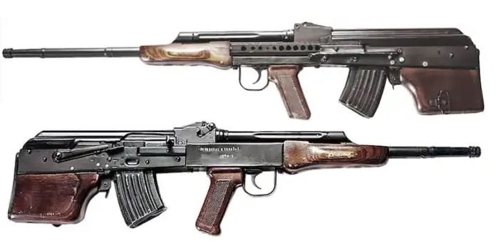 Na fotce níže můžeme vidět raný prototyp ukrajinské experimentální pušky Vepr konstrukce bullpup (základem AK-74):