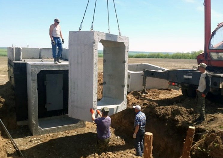 Stavba třístřílnového objektu z prefabrikátů. Tloušťka stěny je 20 cm, ale vzhledem k celkové velikosti je pro manipulaci nutný autojeřáb. Prodloužení čelní a boční stěny slouží k udržení zemního záhozu.