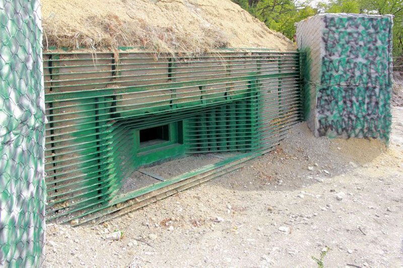 Třístřílnový objekt u Žytomyru nemá mříž proti kumulativním střelám, zato je celý obložen gabiony.