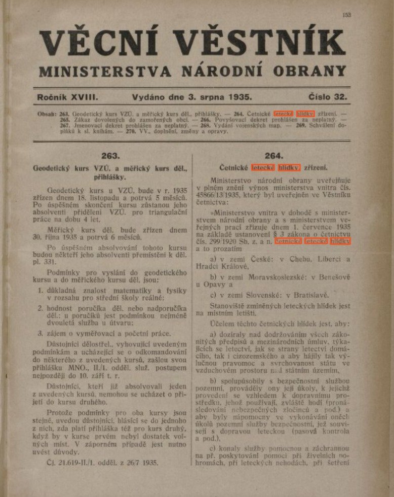 Dne 1. července 1935 byly Ministerstvem vnitra zřízeny Četnické letecké hlídky. Hlavním úkolem těchto hlídek byla ochrana vzdušného prostoru nad státním územím, spolupráce s pozemními bezpečnostními silami třeba při pátrání po zločincích, dále to byly pátrací a záchranné akce třeba při živelných pohromách a jiných katastrofách. Prostě když to tak shrnu, tak letečtí četníci měli chránit vzdušný prostor před narušiteli a pomáhat i těm na zemi v různých situacích, které nastaly a vyžadovaly pomoc i ze vzduchu. Je třeba ovšem připomenout že tyto hlídky vznikly hlavně z toho důvodu, že po nástupu Adolfa Hitlera k moci se situace v našem pohraničí začala měnit. A nebylo to jen kvůli nástupu H ...
