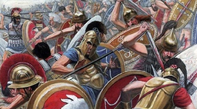 Římští hoplité poraženi a pronásledováni galskými válečníky, 4. století před naším letopočtem. Autorem obrazu Richard Hoook. Bitva na řece Allia se odehrála zřejmě roku 390 př.n.l. mezi galským kmeny Senony, Arverny aj. a Římskou republikou u soutoku řek Tibera a Allia, 11 římských mil severně od Říma. Římané byli poraženi a Senoni následně vyplenili Řím.