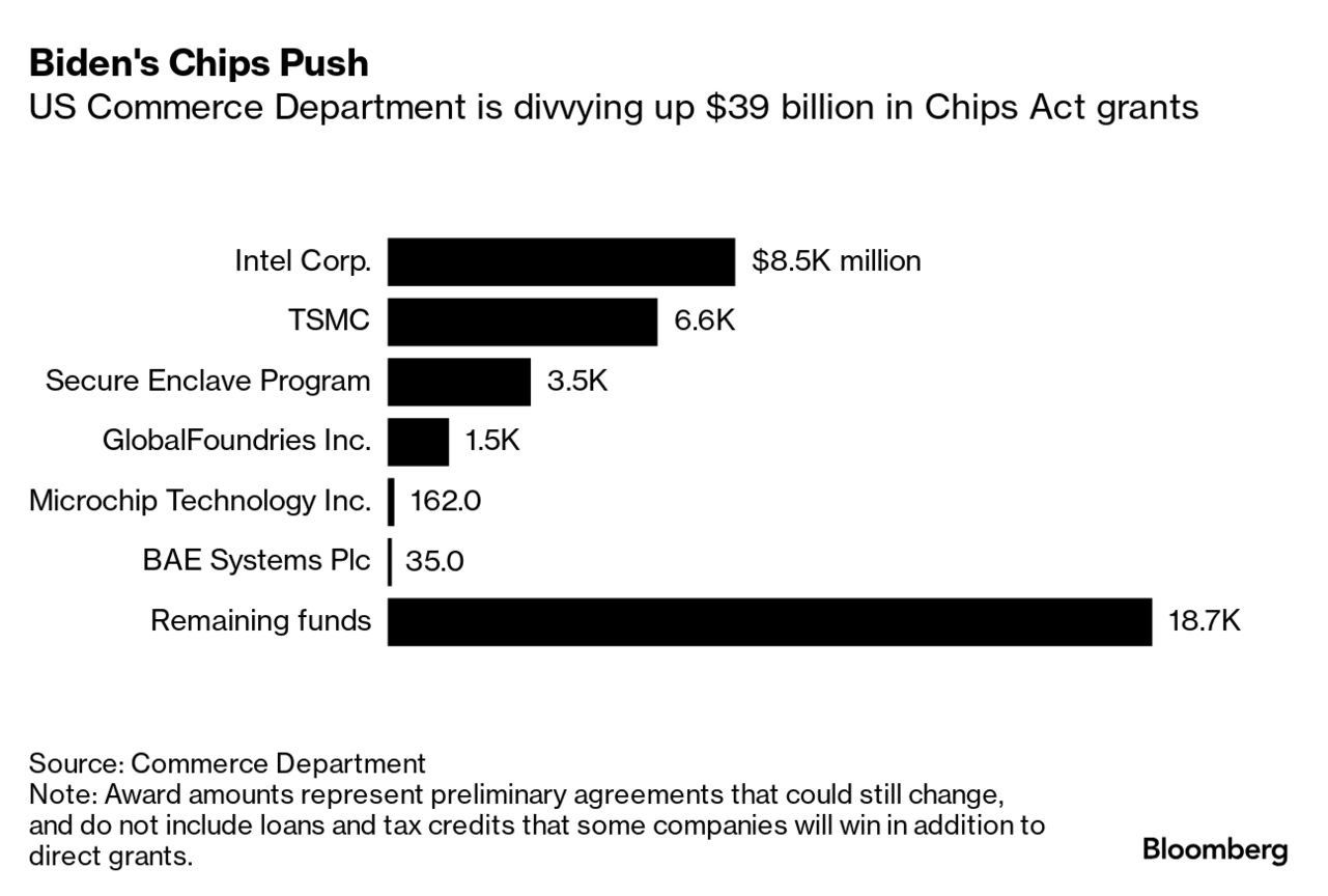 Americká vláda plánuje udělit výrobci čipů Taiwan Semiconductor Manufacturing Company dotaci ve výši 6,6 mld. USD a dále půjčku ve výši 5 mld. USD na pomoc při vybudování výrobního závodu TSMC v Arizoně. Od té doby, co Bidenova administrativa označila výrobu pokročilých čipů za kritickou infrastrukturu pro národní bezpečnost a výrobci v USA už zainvestovali do vývoje a výroby přes 200 mld. USD vybudováním clusterů v Arizoně, Texasu a New Yorku.