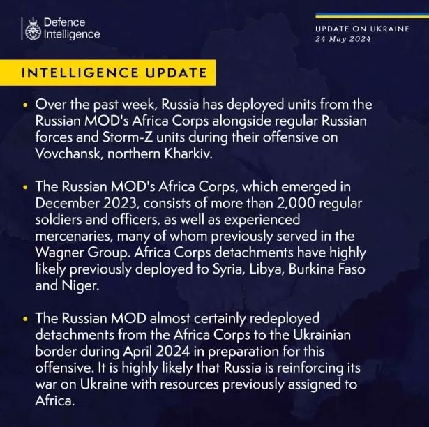 V uplynulém týdnu Rusko nasadilo jednotky svého Afrického sboru ministerstva obrany po boku pravidelných sil a jednotek Šturm-Z během ofenzivy na Vovčansk severně od Charkova. Africký sbor ruského ministerstva obrany, který vznikl v prosinci 2023, se skládá z více než 2 000 řadových vojáků a důstojníků a také ze zkušených žoldáků, z nichž mnozí dříve sloužili v takzvané Wagnerově skupině. Oddíly Afrického sboru byly s vysokou pravděpodobností dříve nasazeny v Sýrii, Libyi, Burkina Faso a Nigeru. Ruské ministerstvo obrany v rámci příprav na ofenzívu téměř jistě přesunulo oddíly Afrického sboru k ukrajinským hranicím v průběhu dubna. Je vysoce pravděpodobné, že Rusko posiluje svou válku na Ukrajině zdroji dříve vyčleněnými pro Afriku.