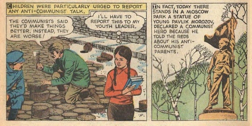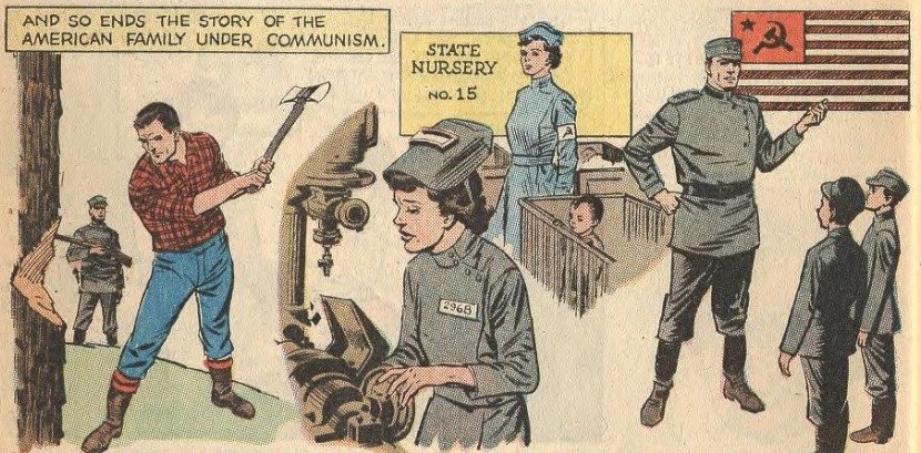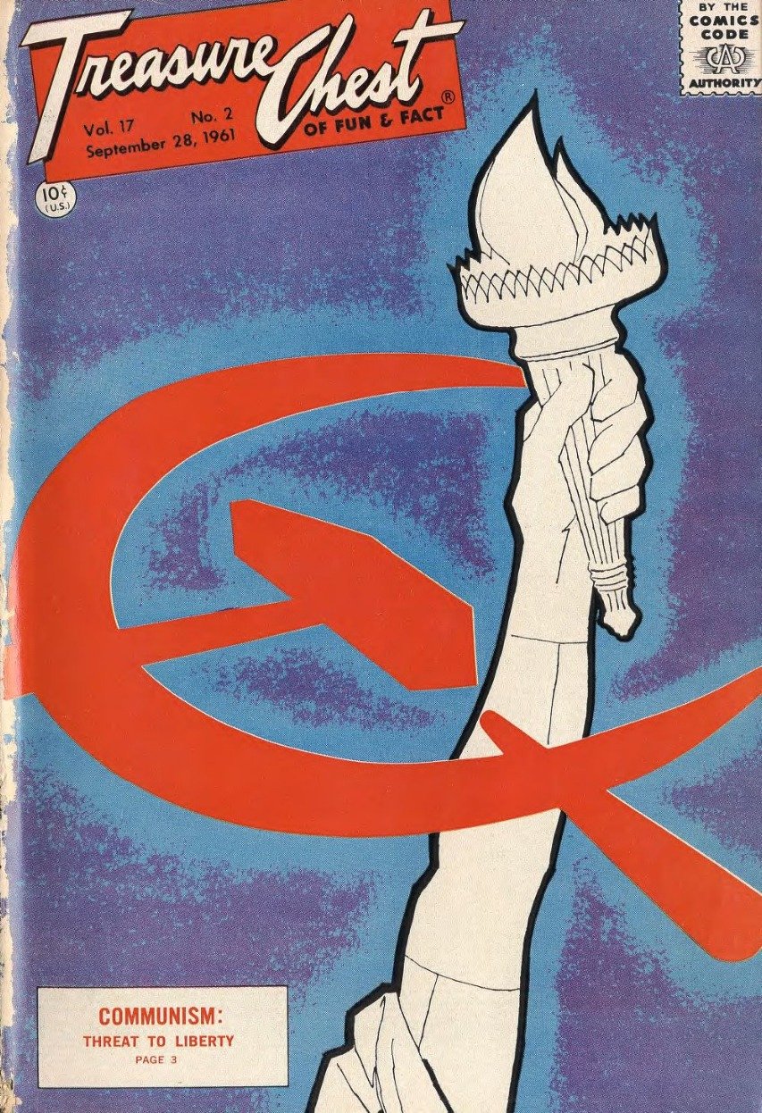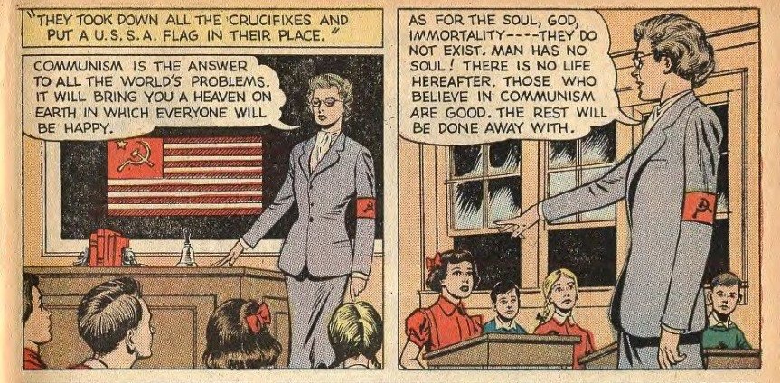 Komiks s názvem This Godless Communism (Tento bezbožný komunismus) vycházel na pokračování v letech 1961–1962, tedy v jedné z horkých fází Studené války. Měl především didaktický charakter, neboť cílem bylo popsat, jak by vypadal život Američanů pod vládou komunistů. Občané se tak měli dozvědět, jaké by to bylo žít ve společnosti bez svobody slova, kde se ve školách vyučuje ateismus a lidé jsou nuceni pracovat pro stát, často bez možnosti být se svými rodinami. Vydavatelem komiksu bylo katolické nakladatelství Treasure Chest, proto byl převážně distribuován v katolických kostelích a katolických školách. V rámci církve se jednalo o relativně nový trend, neboť před druhou světovou válkou byl komiks spojován s nebezpečnými myšlenkami a úpadkovou morálkou. Protože však autoři chtěli oslovit mladé čtenáře, zvolili právě tuto formu. Vydání Tohoto bezbožného komunismu navíc podpořil také někdejší šéf FBI Edgar J. Hoover, který mladistvým čtenářům Treasure Chest poslal dopis, v němž je vybízel k občanské bdělosti. Podle jeho názoru skrze komiks žáci a studenti lépe pochopí povahu komunismu a "budou tak lépe připraveni rozpoznat a určit stoupence komunismu, když se budou pokoušet infiltrovat do různých segmentů naší společnosti." Dopis redakce vydala tiskem s výzvou "na začátku každého příběhu čtěte dopis od ředitele FBI". Tento bezbožný komunismus nakonec školní mládež poučil nejenom o důsledcích komunistického převratu v Americe, ale také o historii a vývoji komunistického hnutí a východního bloku. Na jeho stránkách proto byly k vidění některé známé momenty z východního Německa a Maďarska, případně zde byl popisován nelehký život lidí za železnou oponou. Cílem bylo ukázat, že obyčejní občané komunistických států své vládce nepodporují a tvoří jakousi tichou opozici těchto režimů. Dokonce se v některých momentech setkáme s tím, že tvůrci otevřeně sympatizují s ruským obyvatelstvem. Na jednom místě se tvrdí, že se jedná o "boží stvoření mající těla a duši, ačkoliv jejich vůdci tvrdí něco jiného". Protože do komunistické strany vstoupilo pouze 8 mil. z celkových 215 mil. obyvatel SSSR, autoři komiksu vyvozují, že "Rusové jsou naši bratři v Kristu. Komunismus bychom měli nenávidět, nikoliv však ruský lid, který je jeho obětí." Na závěr je třeba dodat, že komiks obsahuje řadu nepřesností a chyb, které odrážejí nízkou úroveň povědomí Američanů o Sovětském svazu. Zatímco v případě národů východní Evropy se obvykle nemýlí, ohledně jednotlivých etnik svazových republik SSSR již tak jasno nemá. Nelze však očekávat, že by si toho nějaký čtenář všiml. Spíše posloužil jako dobrý úvod k tématu, jež bylo s děsivou naléhavostí součástí každodenního života.