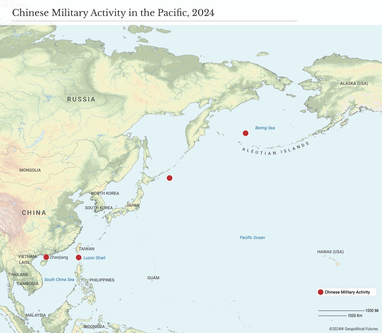 Čínské námořnictvo v červenci provedlo několik rozsáhlých cvičení v západním a severním Pacifiku. Od 10. do 15. července se úderná skupina letadlové lodi Shandong ve vodách východně od Luzonského průlivu zapojila do cvičení zahrnujících stovky bojových vzletů jak letounů s pevnými nosnými plochami, tak i vrtulníků. Současně, 11.7. byla zjištěna čtyři čínská vojenská plavidla ve výhradní ekonomické zóně USA u Aleutských ostrovů a dál pak od 14. července provádělo těsně při pobřeží u města Čan-ťiang protiponorkové letectvo a protivzdušná obrana cvičení s ostrými střelbami za účasti plavidel ruského námořnictva. Podle prohlášení čínského MO se pak společná čínsko-ruská námořní skupina přesunula do severního Pacifiku. Složení flotily, ani oblast činnosti nebyly upřesněny.