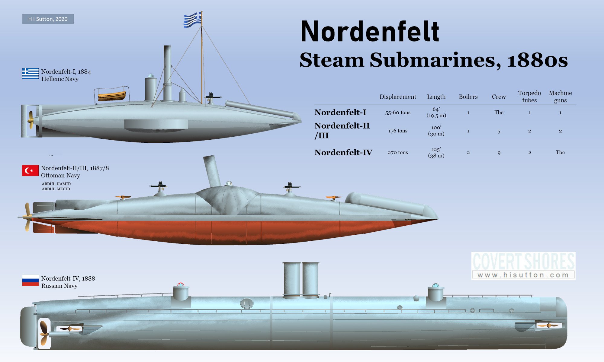 Podobným podmořským plavidlem se zaobíral anglický vynálezce a kněz George William Littler Garrett (1852-1902) a švédský průmyslník Thorsten Nordenfelt (1842-1920). Garrettovu ponorku Resurgam postavily roku 1879 britské loděnice Cochran & Co v Birkenheadu. Měla tříčlennou posádku a poháněl ji Lammův parní stroj s uzavřeným cyklem. Po potížích s pohonem se však roku 1880 potopila (po evakuaci osádky) a její vrak byl znovu objeven až roku 1997. Vývoj šel ale dál a tentokrát pod patronací zmíněného švédského průmyslníka. Roku 1885 byla ve Stokholmských loděnicích dokončena ponorka Nordenfeld I, o délce bezmála 20 metrů a výtlakem 56 tun. K pohonu na hladině sloužil šestiválcový parní stroj s výkonem 75 kW a zatažitelným komínem. Ponorka byla vybavena dvěma tlakovými nádobami, naplněnými při plavbě na hladině. Pod hladinou fungovala podobně jako akumulační parní lokomotivy používané ve výbušných provozech. Využívala páru ze zásobníků, takže nepotřebovala přísun vzduchu. Zajímavostí je, že pro vertikální pohyb používala dvojici svislých šroubů na bocích. Dokázala se ponořit do hloubky 15 metrů, na hladině dosahovala rychlosti devět uzlů (16,5 km/h), pod vodou tři uzly (5,5 km/h). Tato ponorka se dokonce dostala do výzbroje řeckého námořnictva. Byla vyzbrojena jedním torpédem Whitehead ráže 355 mm a dělem Nordenfeld ráže 25 mm. Nikdy však nebyla operačně nasazena a v roce 1901 byla sešrotována. Turecko však nechtělo zůstat pozadu a zakoupilo dvě prakticky identické ponorky Nordenfeld II a III, dokončené v letech 1886 a 1887. Ty byly mnohem větší - při délce 30 metrů měly výtlak 176 tun. Výzbroj tvořila dvě torpéda Whitehead a dva kanony Nordenfeld. Uhlím vytápěný kotel poskytoval páru pro parní stroj s výkonem 186 kW. Ten dokázal ponorce na hladině udělit rychlost šest uzlů (11 km/h). Pára ze zásobníku stačila na dosažení rychlosti čtyři uzly (7,4 km/h) pod hladinou. Ponorka Abdul Hamid (Nordenfeld II) se zapsala do historie tím, že jako první odpálila torpédo pod hladinou, zasáhla cílovou loď a potopila ji. Obě turecké ponorky zůstaly ve službě až do roku 1914, kdy již byly velmi zrezivělé a tedy byly nebezpečné i pro vlastní osádky. Posledním kusem byla ponorka Nordenfeld IV, postavená v roce 1888 pro carské Rusko. Během přesunu do Petrohradu se však převrátila a potopila u Jutska. Sice se ji podařilo vyzdvihnout ze dna, ale Rusové ji odmítli převzít a zaplatit. No a vzhledem k absenci jiného zákazníka byla tedy rovněž sešrotována.