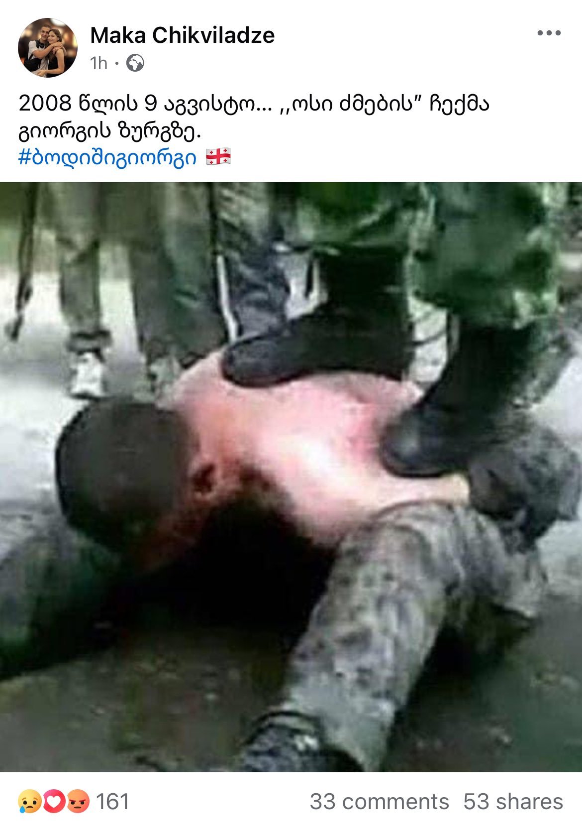 Manželka gruzínského národního hrdiny Giorgia Antsukhelidzeho (1984-2008), který byl mučen a zabit Rusy a Osetiny během srpnové války v roce 2008, reaguje na Ivanišviliho prohlášení o tom, že Gruzínci se musí omluvit svým "osetinským bratrům". Zveřejnila obrázek z videa o mučení a napsala: "9. srpna 2008. Boty našich "osetských bratrů" na Giorgiho zádech. Je mi to líto, Giorgi."