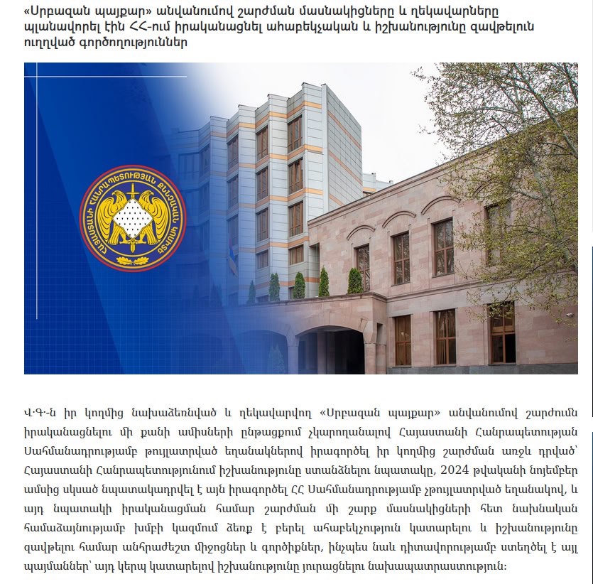 Arménský premiér Nikol Pašinjan uved, že proruské hnutí "Posvátný boj" se pokusilo o převrat a uchopení moci v zemi. Arménie se neustále vymyká sféře vlivu Ruska, a proto se Rusko zapojuje do destabilizačních aktivit a bude se snažit převzít kontrolu nad zemí. Arménie se v uplynulém roce či dvou rozhodla vstoupit do EU, podepsala Chartu strategického partnerství se Spojenými státy a rozhodla se opustit CSTO (Organizaci Smlouvy o kolektivní bezpečnosti, která zahrnuje Arménii, Bělorusko, Kazachstán, Kyrgyzstán a Tádžikistán). Pašinjan prohlásil, že "příslušníci činní v trestním řízení zmařili rozsáhlý a zákeřný plán zločinně-oligarchického duchovenstva na situaci v Arménské republice", jehož cílem byl státní převrat. Podle arménského vyšetřovacího výboru připravovali členové hnutí svůj plán na převzetí moci od listopadu 2024. Za tímto účelem hodlali vytvořit 200–250 úderných skupin o 25 lidech, složených převážně z bývalých vojáků a policistů. Výbor tvrdí, že si také pořídili výbušná zařízení a další nástroje "pro páchání teroristických činů". Podle agentury spiklenci plánovali paralyzovat dopravu způsobováním dopravních nehod, výbuchů a žhářských útoků, organizovat rozsáhlé výpadky proudu a internetu, pálit budovy a provádět další akce ohrožující životy a zdraví občanů.