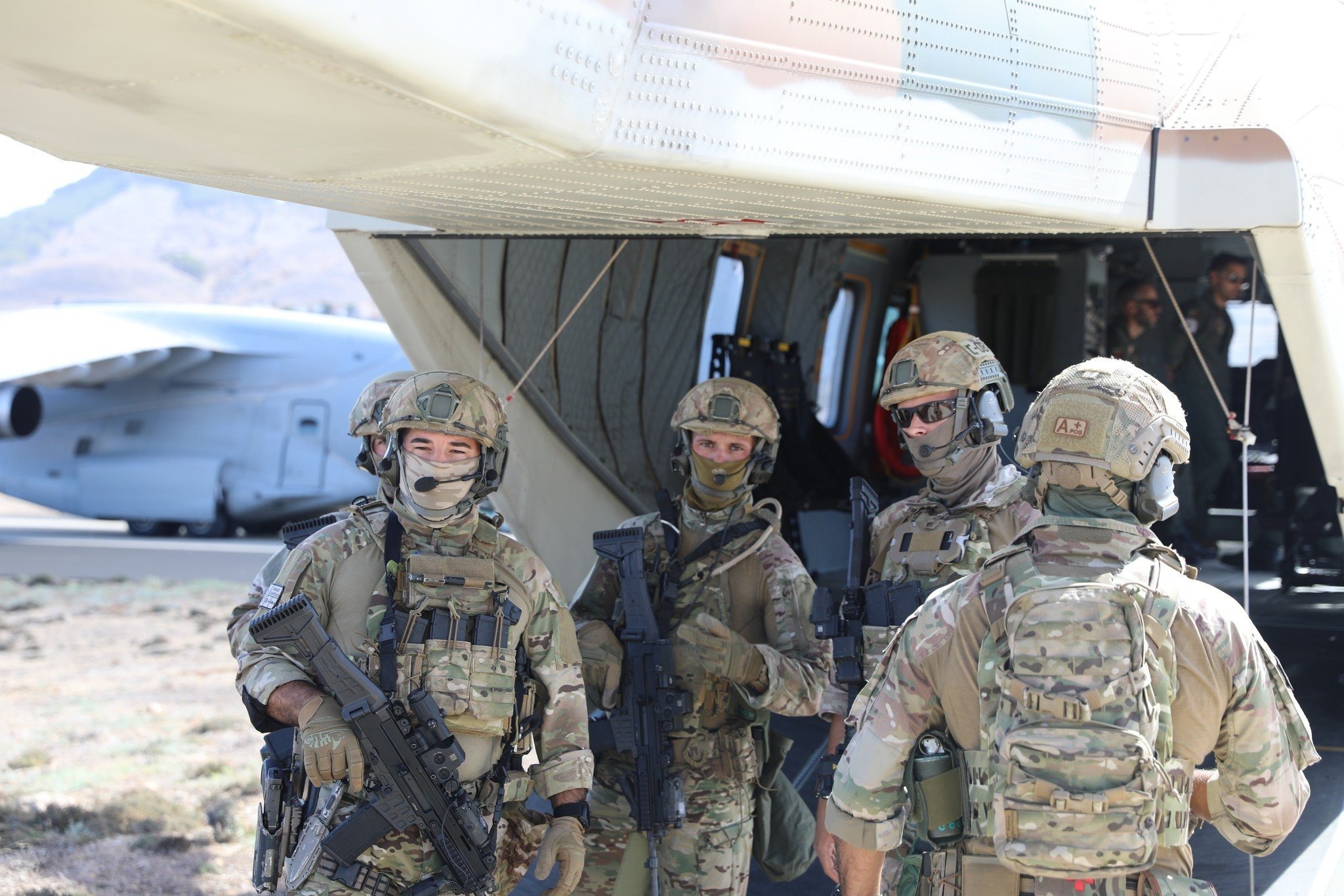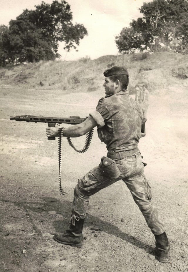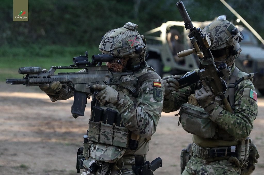 Společné cvičení speciálních sil Portugalska a Španělska. Španěl má v rukou pušku Heckler & Koch G36KE a na přilbě burgundský kříž, starou vlajku španělského císařství. Portugalec je vyzbrojen puškou Heckler & Koch HK416A7.