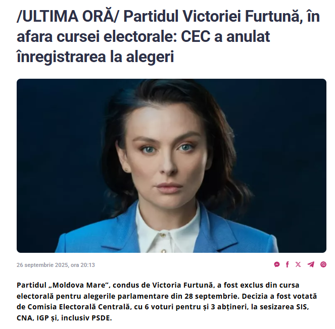 Moldavská ústřední volební komise zrušila registraci proruské strany Moldova Mare vedené Victorií Furtună s odůvodněním nelegálního zahraničního financování a obvinění z uplácení voličů. Rozhodnutí padlo několik dní před parlamentními volbami, které se konají 28. září, a navazuje na samostatný zákaz strany Heart of Moldova.