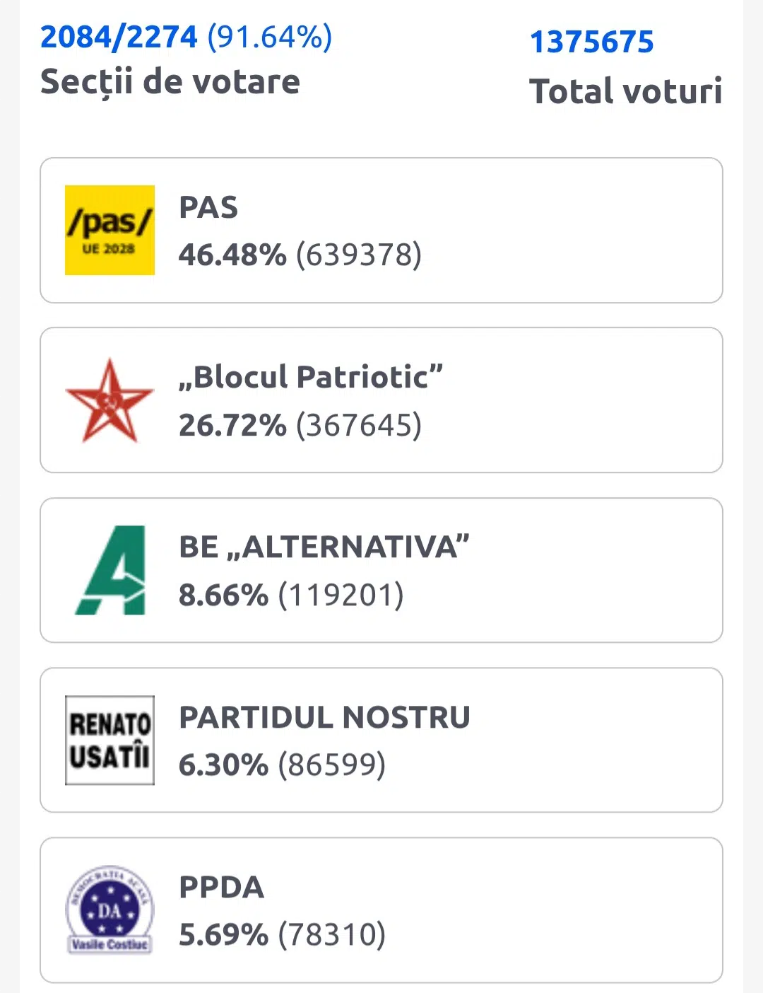 Zdroj:AKTUALIZACE: S více než 90 % spočítaných hlasů v zemi, ale i v diaspoře, PAS získává na síle směrem k Evropě. Existuje vysoká pravděpodobnost, že po přerozdělení PAS sestaví vládu sama. S proruskou stranou se počítá v parlamentu.