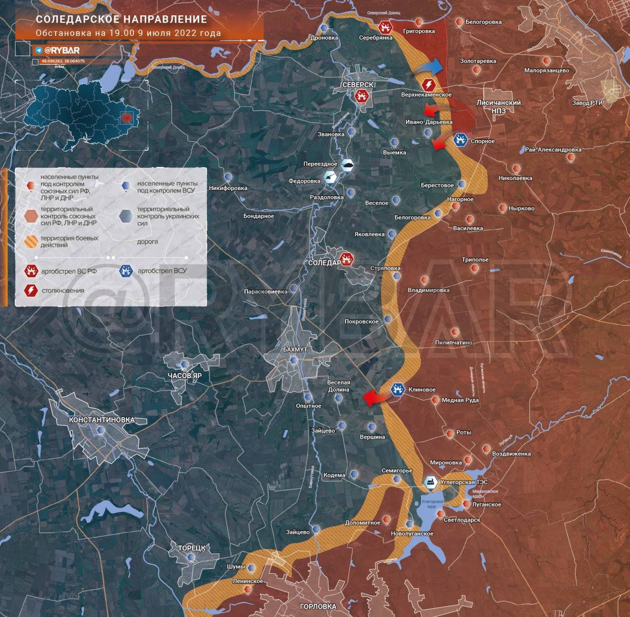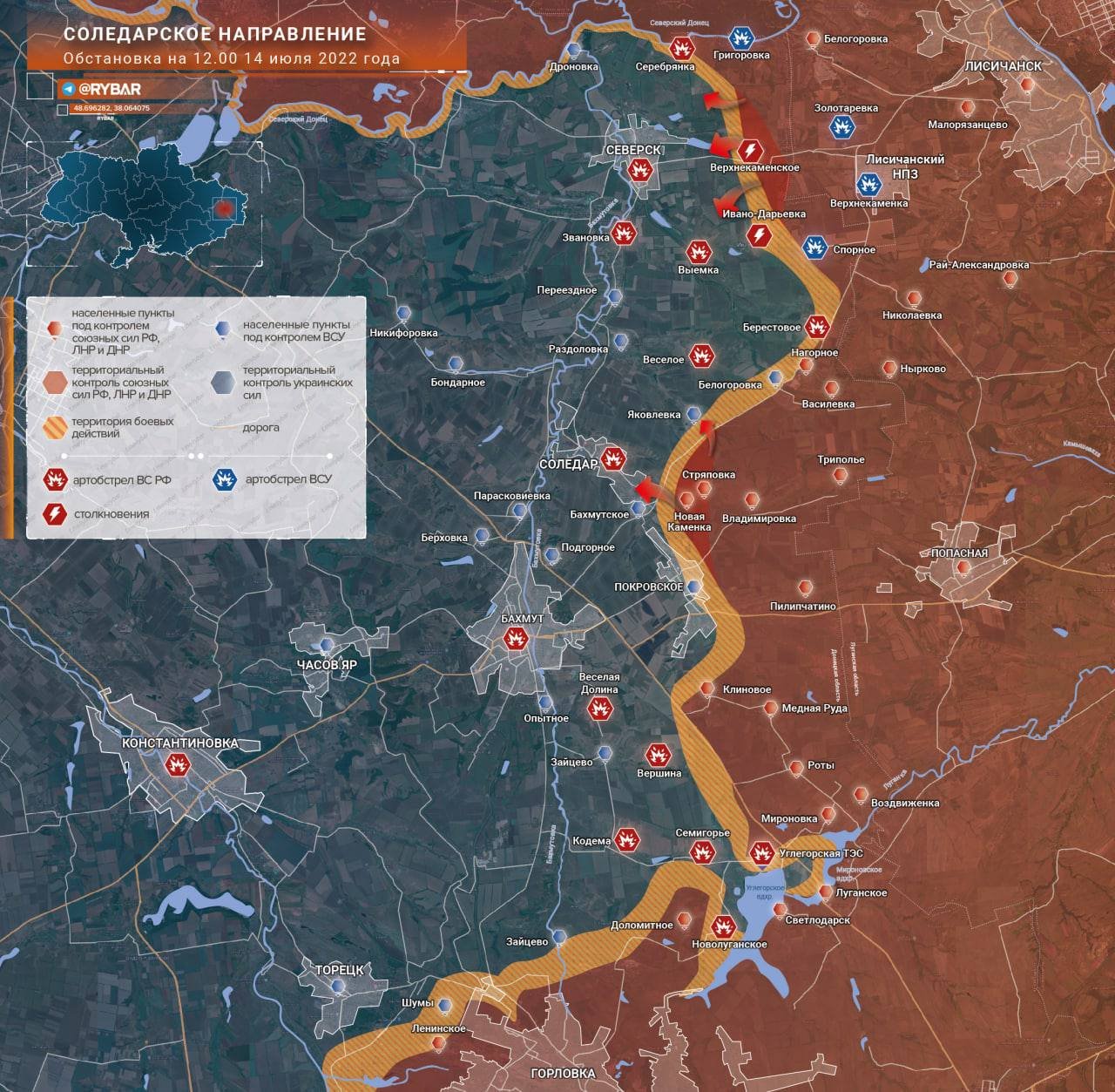 V současné době se postupující síly RF AF a LDPR AF pokoušejí postupovat v oblasti Severska "po ramenou ustupujícího nepřítele". Nepřítel se zde však předem připravil a obsadil nové obranné linie čerstvými silami a pokračuje v zakopávání. Předpověď: Bohužel neočekávám podstatné úspěchy a průlom frontové linie UAF v této oblasti. Pravděpodobné je zde postupné slábnutí bojů.