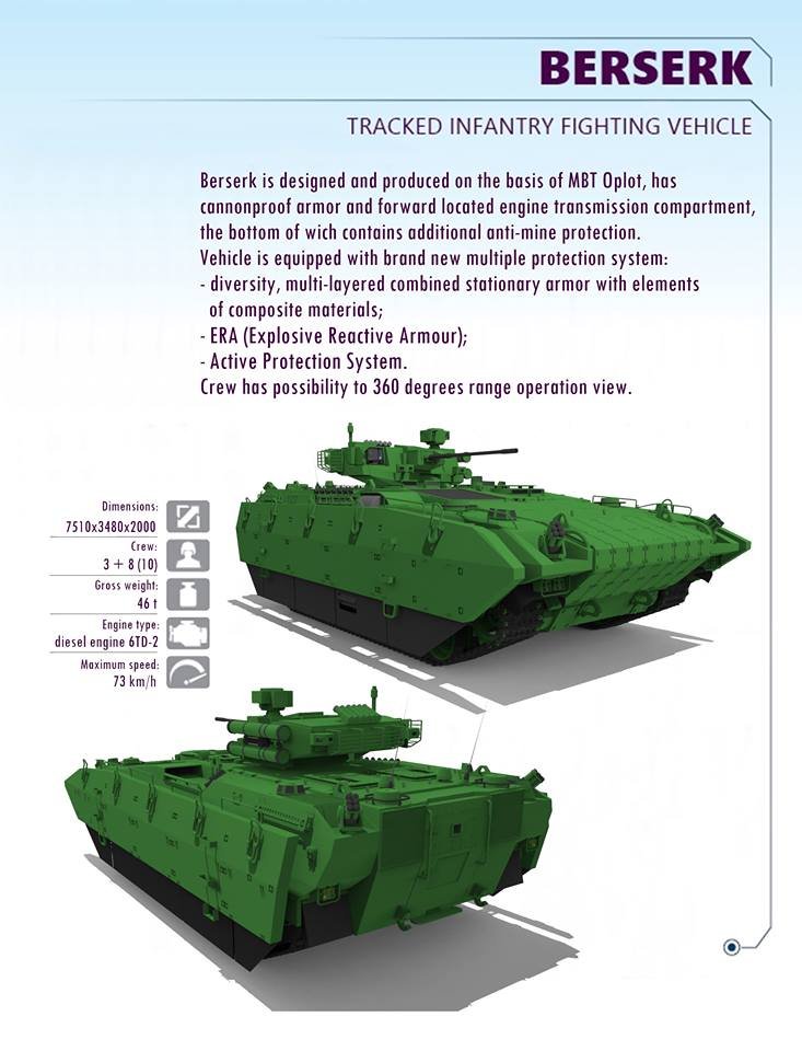 Novým projektem ukrajinského zbrojního průmyslu, je těžké pásové BVP na podvozku tanku T-84 Oplot, pojmenované Berserk. Osádka má být ve složení 3 + 8 (10) a systémy jí poskytnou rozhled 360° kolem vozidla. Ochranu tvoří jak bloky reaktivního pancéřování (ERA), tak nový systém aktivní ochrany. Právě systém aktivní ochrany můžete vidět v rozích vozidla. Výzbroj tvoří dva kusy PTŘS, rychlopalný kanón ráže 30mm a spřažený kulomet. Vnější rozměry Berserka mají být následující: délka 7,510 m, šířka 3,480 m a výška 2,000 m. Vozidlo o hmotnosti 46 tun dokáže rozhýbat dieselový motor 6TD-2 až na rychlost 73 km/h.