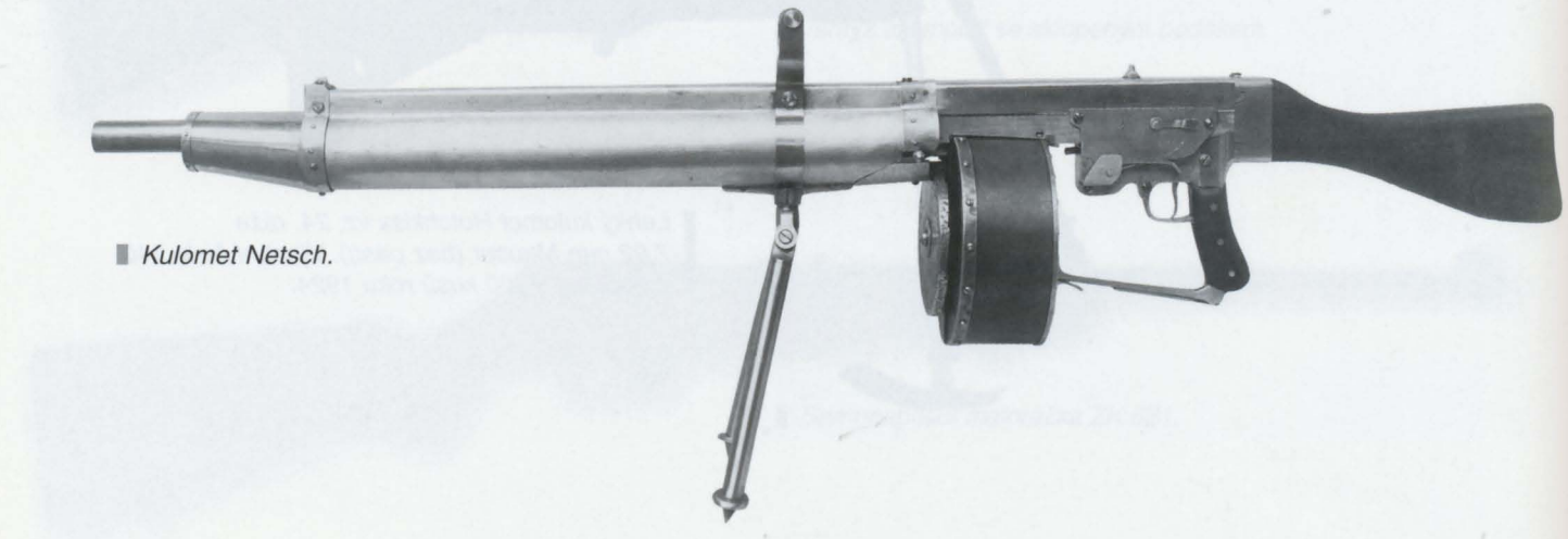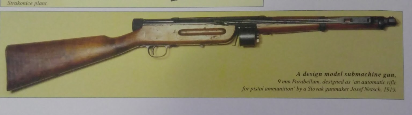 Ještě jsem našel Netschův samopal z roku 1919 se zásobníkem na 10 nábojů ráže 9 mm. Je opravdu velmi titěrný. Povšimnout si můžete i onoho sklopného "ruského" bodáku podél hlavně.