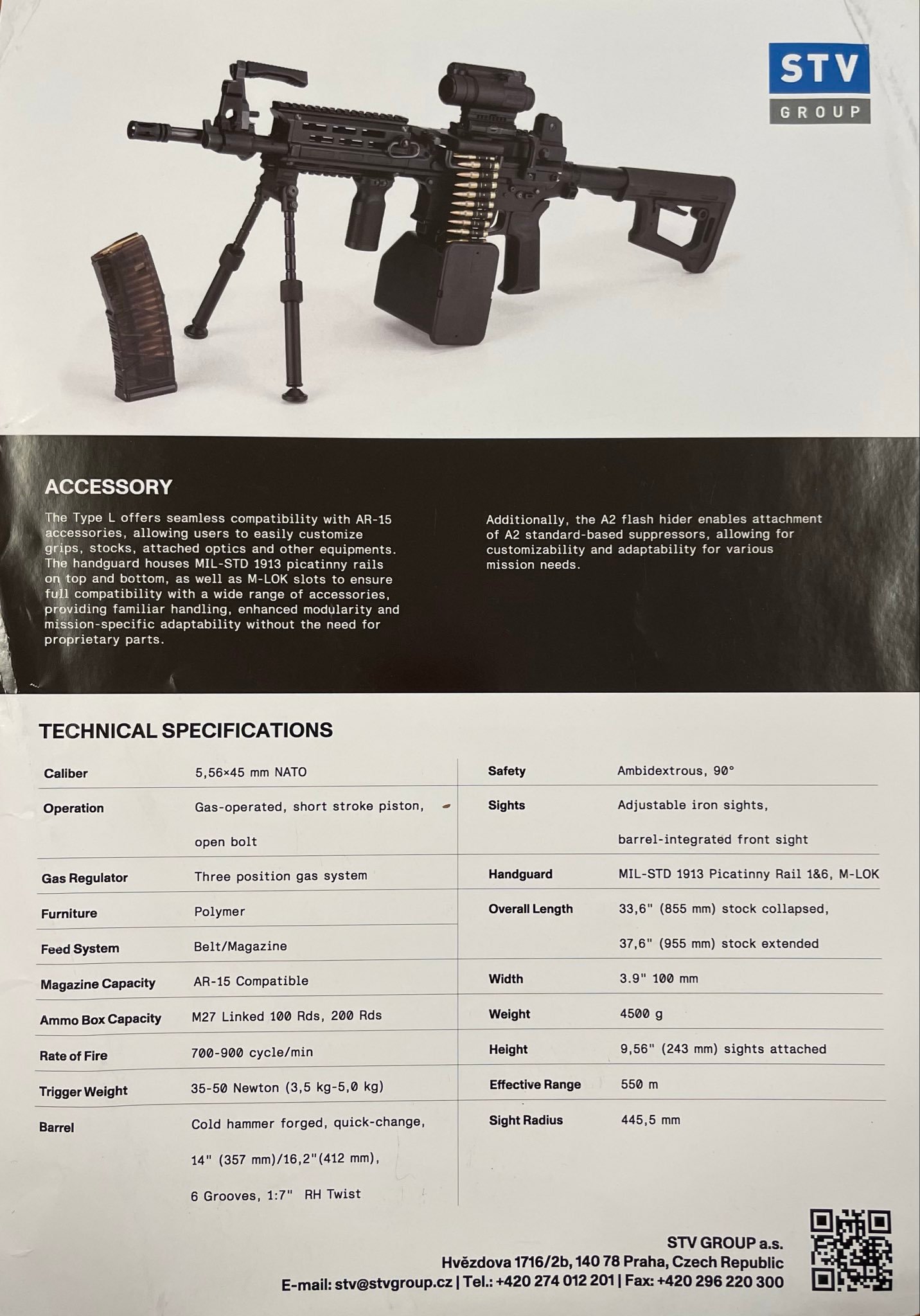 Na veletrhu IDET 2025 vystavovala na stánku STV Group česká společnost Archon Firearms svůj ultralehký kulomet Archon Type L, komorovaný v ráži 5,56x45 mm NATO a vážící 4,5 kg. Kadence je 700-900 ran za minutu a maximální efektivní dostřel 550 m. Byl vyvinut pro splnění operačních požadavků na lehkou podpůrnou zbraň, která funguje mezi útočnou puškou a tradiční automatickou zbraní družstva. Archon Type L je vybaven systémem dvojitého podávání, který umožňuje obsluze přepínat mezi pásovým podáváním munice a standardními zásobníky v závislosti na dostupné zásobě munice a specifických taktických podmínkách. Tato zbraň, určená pro pěchotu, speciální jednotky a jednotky vnitřní bezpečnosti, může být použita v různých operačních prostředích, včetně městských oblastí, horského terénu a expedičních misí. Předvedení přichází v době, kdy moderní vojenské operace stále více zdůrazňují potřebu lehkých podpůrných zbraní, které účinně překlenují mezeru mezi standardními útočnými puškami a tradičními automatickými zbraněmi pro družstva (SAW). Útočné pušky jako M4 jsou chváleny pro svou přenosnost a všestrannost, ale kvůli pevné konstrukci zásobníku a náchylnosti k přehřívání během delšího střetu jsou omezené v poskytování trvalé potlačující palby. Naopak tradiční kulomety, jako je M249, nabízejí vysokou kadenci a větší kapacitu munice, ale mají nevýhody v podobě zvýšené hmotnosti a objemu, které mohou bránit mobilitě vojáků a rychlému manévrování v dynamických bojových scénářích. Vývoj zbraní, jako je Archon Type L, si klade za cíl zvýšit palebnou sílu na úrovni družstva, aniž by to kladlo dodatečnou zátěž na jednotlivé vojáky. Archon Type L je také vybaven systémem rychlé výměny hlavně, což je možné i v polních podmínkách a zachovává tak životnost hlavně během delších přestřelek. Modularita konstrukce se rozšiřuje i na několik lišt Picatinny a M-LOK, které podporují širokou škálu taktického příslušenství včetně optiky, zaměřovacích laserů a předpažbí. Standardní záložní montovaná mířidla a rychloupínací úchyty pro popruhy dále zvyšují jeho bojovou připravenost a ovladatelnost. Archon Firearms je především známá jako výrobce prémiových pistolí s modulárním designem a unikátním systémem uzamykání závěru AF-Speedlock.
