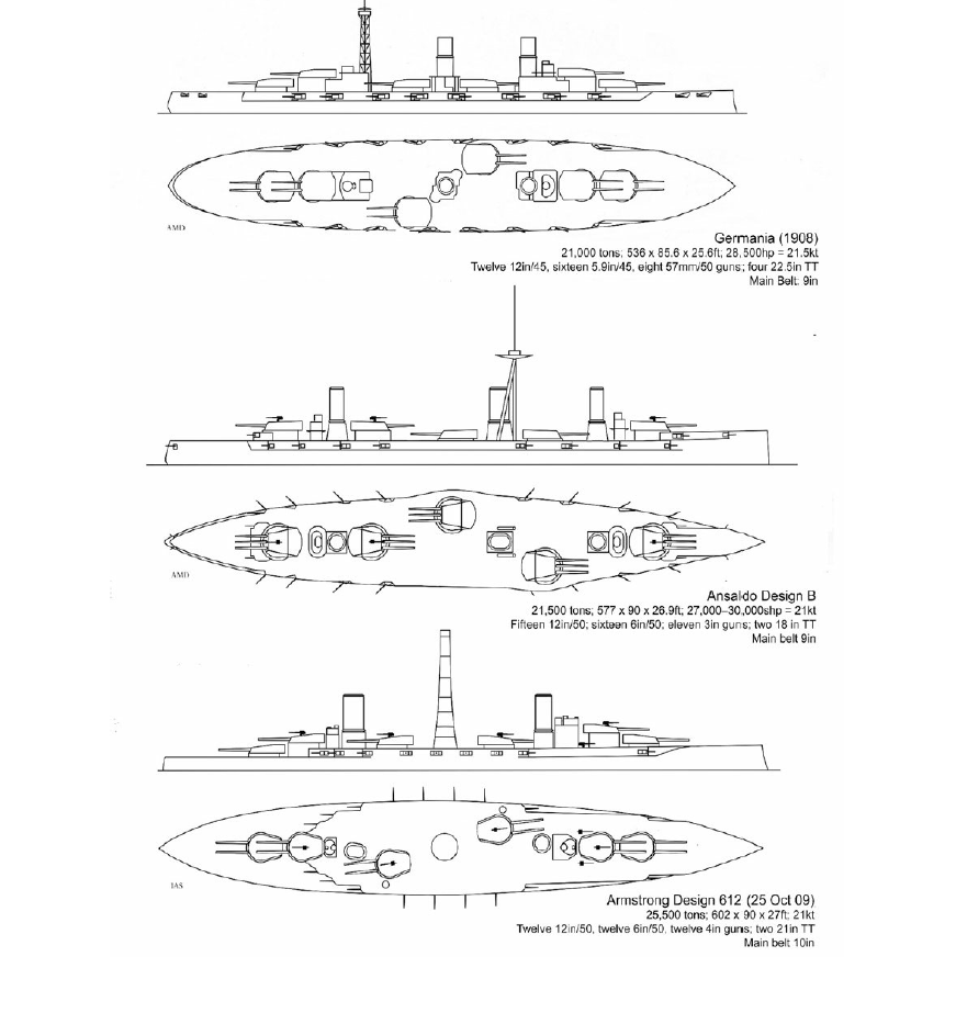 Zde vidíme několik projektů přihlášených do prvního kola konkursu na argentinské bitevní lodě:jarl píše: ↑4/3/2011, 19:47 Argentina byla zpočátku vázána oním pětiletým moratoriem na stavbu nových válečných lodí, jež ovšem v roce 1907 vypršelo a následujícího roku bylo v Londýně vypsáno mezinárodní výběrové řízení na stavbu dvou bitevních lodí (později měla přibýt ještě třetí), do něhož se přihlásilo patnáct loďařských společností z pěti zemí, ale některé odradil neseriózní přístup zadavatele natolik, že se druhého kola nezúčastnily. Argentinci totiž ve snaze minimalizovat náklady zprvu nevyhlásili vítěze, ale zkombinovali nejvhodnější návrhy do vlastního projektu, který měla realizovat společnost vzešlá z druhého kola konkursu. Díky těmto nevšedním praktikám získala zakázku americká společnosti Fore River Shipbuilding Company, jež porazila všechny renovované konkurenty (Armstrong, Vickers, Blohm & Voss, Ansaldo, Cramp, Forges et Chantiers) nejnižší cennou a evropské loděnice se musely spokojit se zakázkami na dvanáct torpédoborců.