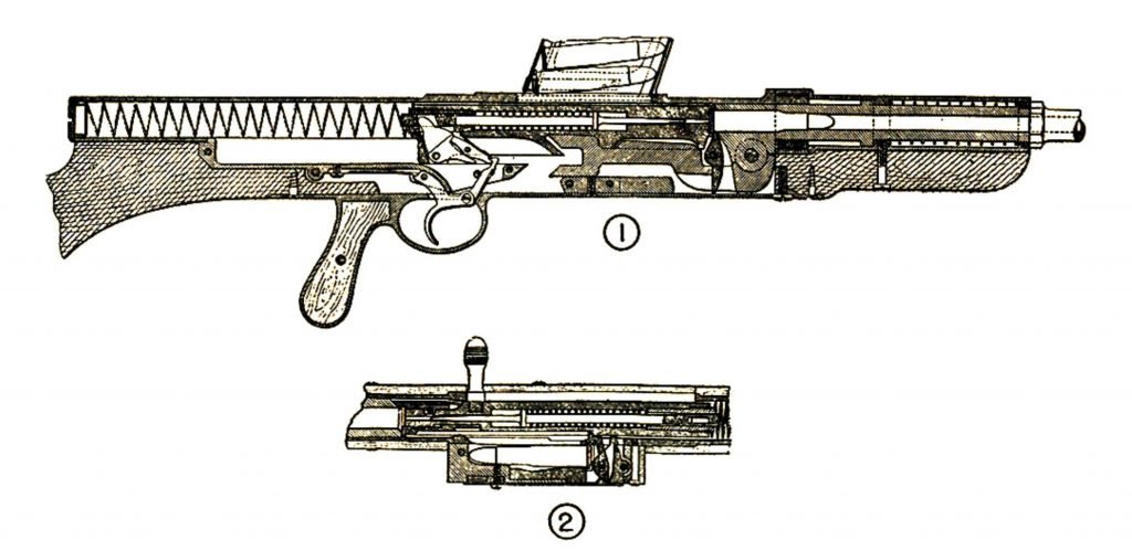 Šéfkonstruktér společnosti OEWG (Österreichische Waffenfabriks-Gesellschaft) ve Steyru, světoznámý Ferdinand Mannlicher (1848-1904) se na počátku své kariéry zabýval náhradou zastaralých pěchotních pušek Werndl a jejich potencionální přestavbou. Tato práce vyústila v pokusnou pušku M1885, která byla předchůdcem světoznámé opakovací pušky M1895. V této době, ale mladý Mannlicher (nebylo mu ani třicet let) experimentoval i s mnohem inovativnější konstrukcí, kterou byla samonabíjecí puška – zkráceně Handmitrailleuse M1885 (doslova lehký ruční kulomet). Na této zbrani pracoval celkem dva roky, od roku 1883. Na začátku ještě zmíním, že tato zbraň nesmí být zaměňována s již zmíněnou opakovací puškou M1885. Tato nová pokroková zbraň využívá zpětného rázu při výstřelu (o 32 mm), kdy rychle dojde k odemčení závěru, vyhození prázdné nábojnice, napnutí pružiny úderníku a vsunutí nového náboje do nábojové komory. Načež je závěr uzamčen a zbraň je připravena k dalšímu výstřelu. Samonabíjecí cyklus funguje na principu odběru prachových (spalných) plynů z hlavně. Tyto pušky umožňují na jedno stisknutí spouště pouze jeden výstřel. Krom poloautomatické (samonabíjecí) verze, Mannlicher pracoval i na verzi plně automatické (samočinné pušce), díky čemuž se tato zbraň řadí mezi první lehké ruční kulomety.