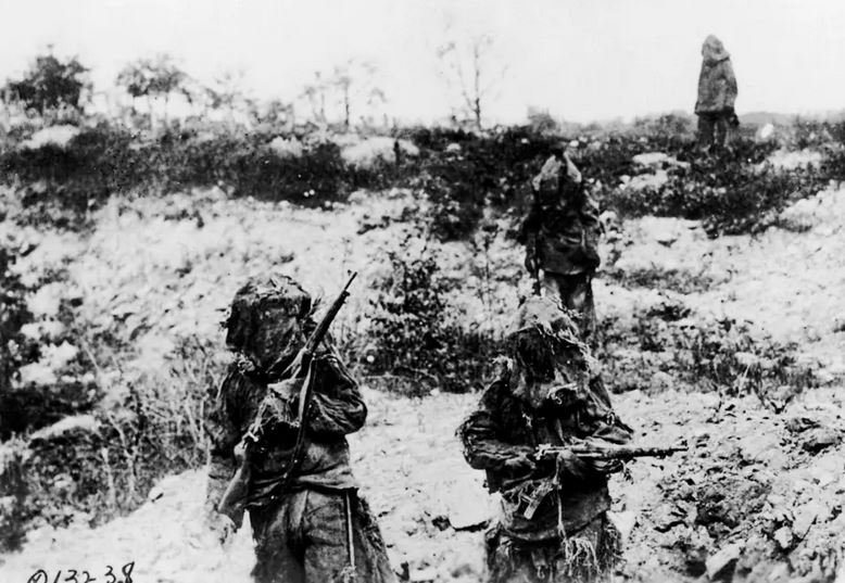 američtí odstřelovači v kompletních maskovacích oblecích (Ghillie suits) překračují Sommu