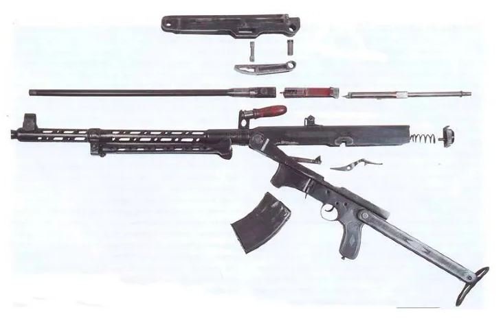 Michail Timofejevič Kalašnikov (1919-2013) se narodil 10. listopadu 1919 ve vesnici Kurja v Altajské oblasti. Na podzim roku 1938 nastoupil základní vojenskou službu a již zde se projevil jeho technický talent. Po vypuknutí války bojoval v tanku BT-7 a v říjnu 1941 se zúčastnil bitvy o Brjansk, kde utrpěl vážné zranění ramene po zásahu svého tanku BT-7. Byl převezen do nemocnice ve městě Jelec, kde z nemocniční knihovny získal první poznatky o konstrukci zbraní. Po propuštění z nemocnice dostal šestiměsíční dovolenou, kterou využil ke konstrukci svého prvního samopalu pro náboj 7,62x39 mm. Během zkoušek se zjistilo, že samopal funguje bez problému a tak dostal šanci provést vylepšení zbraně v Moskevském leteckém institutu. Po přezkoumání vylepšeného modelu A. A. Blagonravem, byl na jeho doporučení Kalašnikov převelen do GAU (Glavnovo artilerijskovo upravlenija) – Hlavní dělostřelecký úřad. Souběžně s vývojem samopalu představil rovněž vlastní prototyp lehkého kulometu pro náboj 7,62x54R. Celková váha činila 7,5 kg, kadence 100 ran/minutu byla dostatečná, aby obsluha mohla bez problému vystřelit až 500 nábojů bez nutnosti chlazení hlavně. Samotný zásobník pojal pouze 15 nábojů a není známo, zda byla v plánu i jiná varianta podávání munice. Kalašnikovův návrh byl představen v června 1942, spolu s konkurenčními návrhy od Vladimirova, Děgťareva, Simonova a Gorjunova. Konstruktér měl dva a půl měsíce pro dodání pěti kusů pro střelecké zkoušky. Výsledek zkoušek jsem bohužel nedohledal, ale očividně zaveden nebyl. Osobně mi docela dost připomíná německý lehký kulomet Bergmann, případně modernější MG34, ale koncept je docela dost zajímavý.