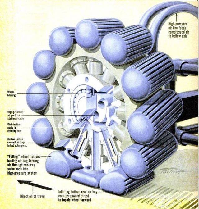 Podle mého názoru šlo z jeho pohledu spíše o konstrukci měsíčního vozítka (v té době akceptovatelné stranou i vládou), na což šli sehnat peníze. Tomu odpovídá i ta obratnost. V jednom z těch Raseho odkazů jsou obrázky vhodnějšího uspořádání těch nafukovacích měchů. Z celé té práce se určitě něco vytěžilo. (Pro mne je to aplikovatelné tak jedině u vozidel dinosauřích rozměrů někde na planetě Duna.)