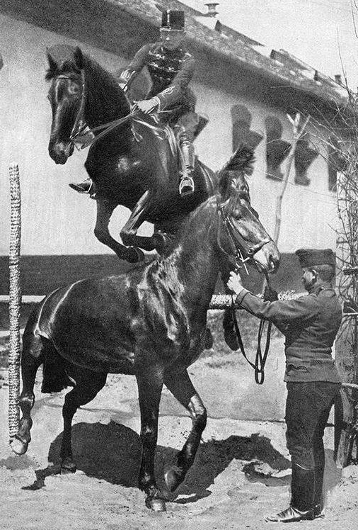 Snímek pochází z některých jezdeckých kasáren rakousko-uherské armády, snad v Uhrách. Autorem fotografie je A. Menyhárt a bohužel nejsou známy žádné další informace. Jezdectvo bylo zbraní rakouskou-uherské branné moci, v níž se v maximální míře udržel tradicionalismus a konzervativismus. Historii několika jezdeckých pluků bylo možno sledovat až do doby třicetileté války. Organizační struktura armádního jezdectva zahrnovala celkem 42 pluků: 15 dragounských (Dragonerregiment), 16 husarských (Husarenregiment) a 11 hulánských pluků (Ulanregiment). Jezdecký pluk měl šest eskadron s celkovým počtem 900 jezdeckých koní. Pluky byly včleněny po dvou do jezdecké brigády a dvě jezdecké brigády tvořily jezdeckou divizi. Kromě armádního jezdectva bylo k dispozici 6 hulánských pluků zeměbrany, 1 oddíl horských tyrolských jezdeckých střelců a 1 oddíl horských dalmatských jezdeckých střelců. Uherská zeměbrana měla ve stavu 10 husarských pluků, a několik husarských pluků vytvářela i uherská domobrana.