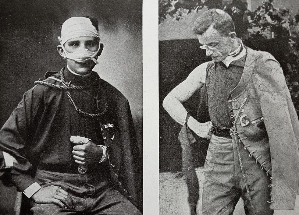 Sokolské slavnosti o "Moravském dnu" v Brně v červnu 1914 byly několikráte přerušeny. Nejprve zprávou o sarajevské tragédii, poté protičeskými násilnostmi německých výtržníků a nakonec hrozným lijavcem. Na první fotce: německými výtržníky poranění a potrhaní Sokolové Jaroslav Habr z Hronova a Dr.Náprstek z Kladna. Níže pak hůl, kterou při nedělní provokaci o "Moravském dnu" zanechali brněnští buršáci v rukou přepadeného. Zdroj Pavel Slaby pro skupinu Jak se žilo za Rakouska-Uherska.