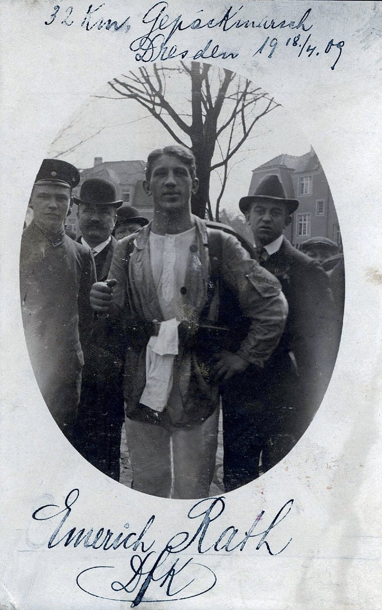 V Německu Emericha Ratha rovněž proslavily i chodecké závody na padesát kilometrů s vojenskou výzbrojí o váze kolem třiceti kilogramů. Vyhrál jich jedenáct, první roku 1905. Zanedlouho o této zvláštní disciplíně vydal knihu "Der Gepäckmarsch über 50 Kilometer und w arum ich hegte" (Proč chovám náklonnost k pochodům se zavazadlem nad 50 kilometrů ). Roku 1909 vytvořil rekord v čase šest hodin třináct minut, což byl poloviční čas, než jaký armáda požadovala. Když mu v závěru jednoho takového závodu hlásili, že má hodinový náskok, udělal žertík pro obveselení publika: před cílem zastavil, nechal si přinést umyvadlo a šatstvo, umyl se, převlékl a teprve pak překročil cílovou čáru.