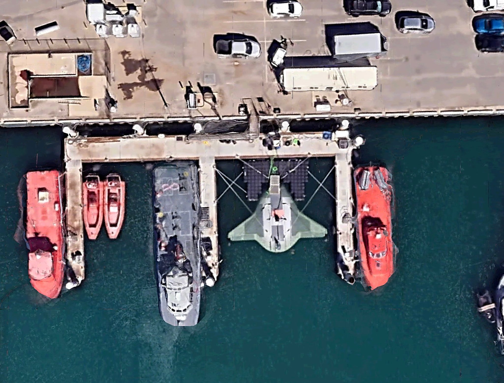 Snímek z Google Earth ukazuje prototyp podvodního dronu Manta Ray, který nedávno dokončil testování, zde v Port Hueneme v Kalifornii.