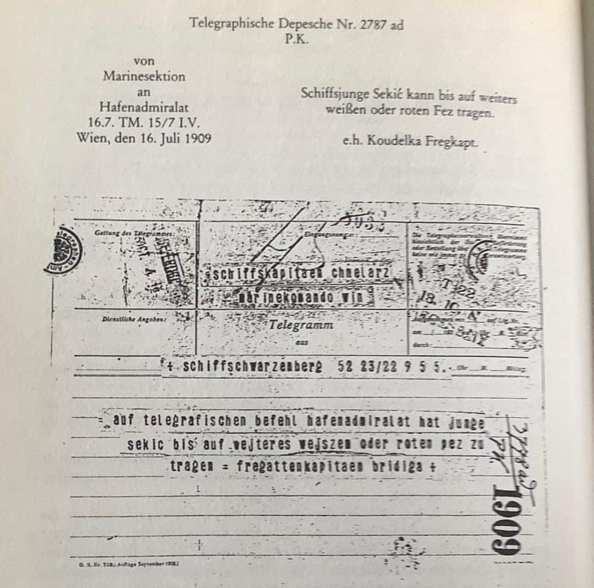 Devátého července 1909 kotvila fregata Schwarzenberg v přístavu Šibenik. Tento starý veterán bitev u Helgolandu a Visu zažil již lepší časy, ale nyní sloužila jako školní loď. Na palubě a v lanoví se proháněli mladí plavčíci a staří zkušení námořníci je vychovávali k tomu, aby se z nich stali dobří námořníci. Mezi plavčíky byl i Lutvo Sekić, rodák z Dvorniku u Dolnja Tuzla. Mladý Bosňák muslimského vyznání před pěti dny obdržel uniformu, spodní prádlo a další vybavení které mu náleželo podle příslušných předpisů a také námořnickou čepici. Vše se zdálo být v naprostém pořádku, leč včera 8. července 1909, hlásil plavčík Sekić svému veliteli, že se musí obávat vydědění, pokud jeho otec zjistí, že nosí čepici a ne fez. V příštích dnech jej mladého námořníka navštívit jeho bratr a tak by se tuto nepříjemnost nepodařilo utajit. Bylo to poprvé, co byl na loď přijat jako plavčík muslim. Ve služební knize II-3 nebyl "fez" uveden, ba dokonce o něm nebyla ani zmínka. Proto byla 9. července 1909 na velitelství v Pule odeslána zpráva o plavčíku Sekićovi s žádostí o vydání rozhodnutí v této věci. Velitelství se v tomto zvláštním případu necítilo kompetentní rozhodnut a tak 11. července byla zpráva s několika doplňky urychleně předána do Vídně, námořní sekci ministerstva války. Po pár dnech bylo plavčíku Sekićovi uděleno povolení nosit k uniformě bílý nebo červený fez. Tato událost spustila lavinu dopisů mezi námořnictvem, ministerstvem financí a náboženskými autoritami v Bosně a Hercegovině na téma pokrývek hlavy muslimských příslušníků námořnictva. Přes různé návrhy (např letní bílý fez a zimní modrý, aby barvy odpovídaly námořnickým čepicím) se dospělo k závěrečné dohodě a 30. srpna 1913, vyšel doplněk bodu 117. výstrojního předpisu námořnictva "Organischen Vorschrift für das Personal der k. u. k. Kriegsmarine, III. Hauptstück, II. Teiladjustierung und Ausrüstung." Pro příslušníky námořnictva mohamedánského vyznání je jako pokrývka hlavy standardizován fez; mohou však nosit čepici předepsanou pro příslušnou šarži a hodnostní skupinu.