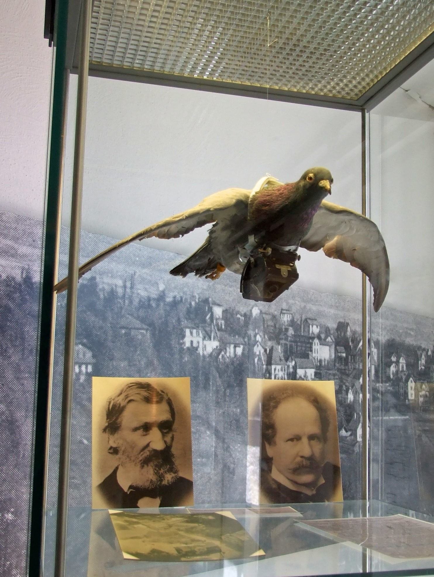 Dnes se k vojenskému průzkumu bojiště běžně používají drony, leč poněkud překvapivě ke stejnému účelu se naši předkové snažili využít holuby. Otcem nápadu osadit holuba automatickým fotoaparátem, byl německý lékárník a fotograf Dr. Julius Gustav Neubronner (1852-1932) z Kronbergu u Frankfurtu. Již kolem roku 1903, využíval holubí poštu k roznášce léků do sanatoria v blízkém Falkensteinu. Tehdy jeho holubi roznášeli balíčky až o váze 75 gramů. Když se jednoho dne poštovní holub ztratil v mlze a dorazil o čtyři týdny později, nechal se Neubronner inspirovat nápadem opatřit ptáka automatickým fotoaparátem nebo kamerou, která by sledovala jeho cestu. Začal tedy pracovat na zařízení, kdy miniaturní fotoaparát byl usazen na postroj z kůže zpevněný hliníkovým krunýřem, načež byl připevněn na holubí hruď. Samotné fotoaparáty se lišily, přičemž mohly mít jeden objektiv, dva přičemž snímky byly ve formátu 5 x 5 cm, objektiv pro pořízení panoramatických snímků (3 x 8 cm) nebo fotoaparát se sekvenčním snímáním osmi po sobě jdoucích fotografií. Největší a nejtěžší z nich měřil přibližně 10 x 6,5 cm a vážil 75 g. Holubi byli odváženi až na vzdálenost 100 km od domova, zde jim byl nasazen postroj a vypuštěni. Pták obvykle letěl přímým směrem domů, ve výšce 50 až 100 metrů a rychlostí až 15 km/h. Pneumatický mechanismus přesně určoval čas mezi jednotlivými snímky. Svůj nápad se pokusil Neubronner patentovat již roku 1907, ale nejprve byl Císařským patentovým úřadem zamítnut jako neproveditelný, jelikož se obecně věřilo, že nosnost holuba domácího je příliš nízká, než aby dokázal nést celé zařízení. Změna postoje přišla po předložení pořízených fotografií a patent tak byl přijat v prosinci 1908. Následující rok předvedl svůj vynález na Mezinárodní fotografické výstavě v Drážďanech a první Mezinárodní výstavě letectví a kosmonautiky, tehdy ještě konané ve Frankfurtu nad Mohanem. Návštěvníci v Drážďanech mohli pozorovat přilétající holuby, neprodleně byly snímky vyvolány a vytisknuty (!) Vynález si tak získal mnohá ocenění a to i při prezentacích v zahraničí.