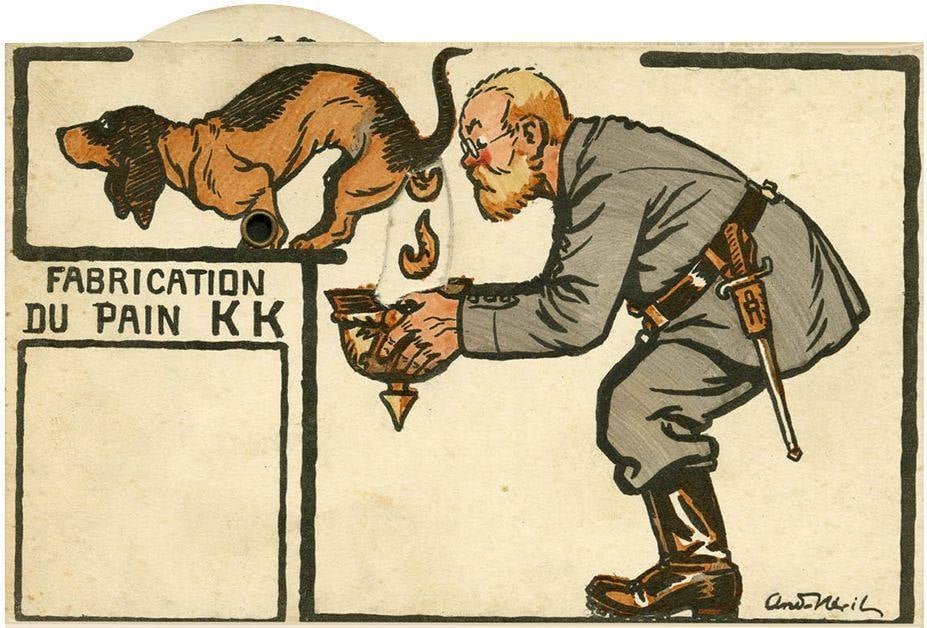 Francouzi se chlubili tím, jak jejich vojáci jedí jemný bílý chléb, zatímco Němci tento tmavě hnědý KK chléb. Nutno dodat, že ve francouzštině lze KK vyslovit také "caca". Odtud k přechodu na "cacca" (tedy hovínko) byla jen krátká cesta. Na fotografii tak můžeme vidět parádní francouzskou pohlednici s otočným kolečkem, jehož uvedení do pohybu rozjede "nekonečný příval" padajících hovňousů - tajné ingredience pro pečení německých chlebanů.