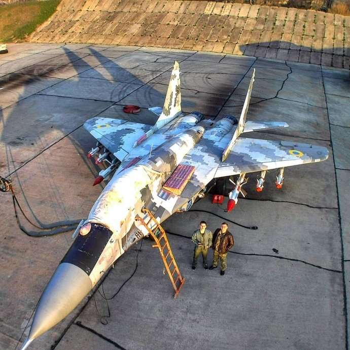 Pilot 40. BrTA ze základny Vasylkiv hrdě předvádí nášivku se jménem "Ghost of Kyiv", které si jednotka vysloužila v tvrdých bojích s ruskými agresory. Migy-29 v pozadí nesou starou kamufláž a zřejmě nejsou letuschopné. Na stojánce, tak mohly sloužit jako případná návnada pro ruské útoky, aby tak uchránily provozuschopné Migy, které byly naopak rozptýleny z hlavních základen na záložní letiště a improvizované plochy (včetně silničních úseků).