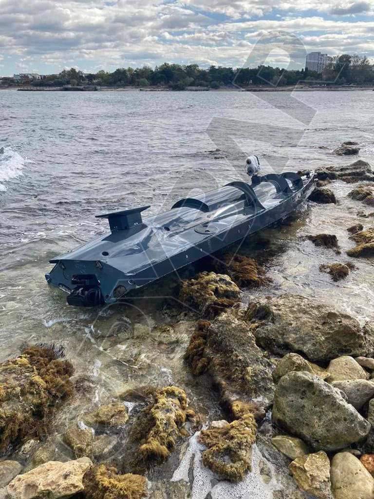 Na břehu v Sevastopolu se našel ukrajinský námořní dron kategorie USV - uncrewed surface vessel.