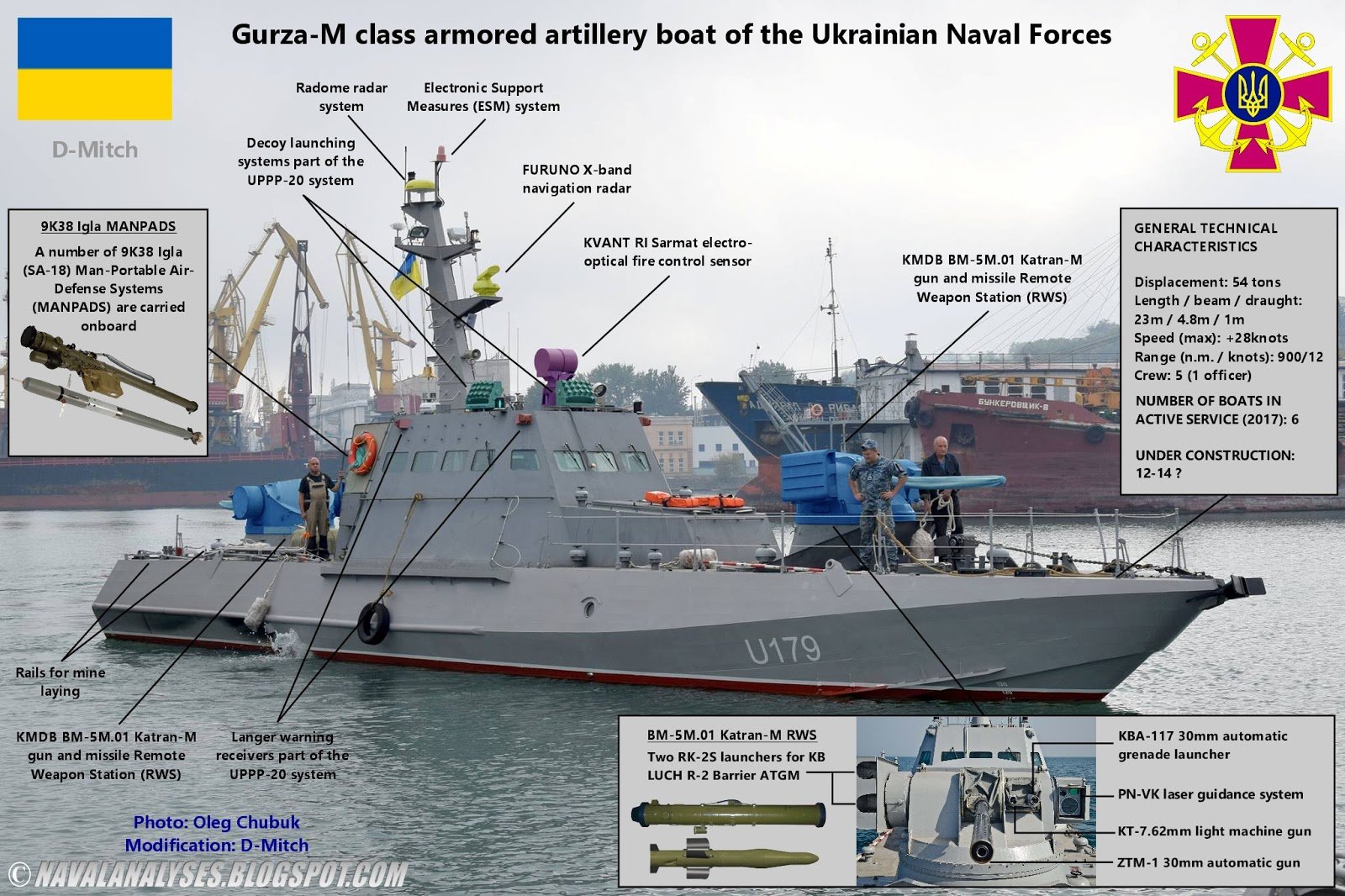 Krom nákupu šestnácti nových amerických člunů typu Mark VI, pracují na Ukrajině rovněž na menších člunech třídy Gjurza-M. Dva z nich, Nikopol a Berďansk, byly v Kerčském průlivu v roce 2018 zajaty společně s remorkérem Jany Kapu. Na podzim 2019 je Rusové vrátili, leč v dezolátním stavu a oprava zabere nějaký čas. Doposud bylo postaveno celkem sedm člunů třídy Gjurza-M a v plánu je celkem dvacet. Výzbroj tvoří zbraňové stanice KAU-30M s kanony ZTM-1 ráže 30 mm a spřaženými granátomety i kulomety. Je možné je osadit řízenými střelami Barrier. Byť Ukrajina přišla o většinu infrastruktury potřebné ke stavbě a opravám válečných lodí, zaměřují se na stavbu civilních plavidel a výhledově i větších jednotek. Konkrétně jde o čtyři víceúčelové korvety, přičemž první se má jmenovat Volodymyr Velykyj, na počest vládce Kyjevské Rusi z přelomu desátého a jedenáctého století. Celkové náklady za výstavbu čtyř korvet třídy Volodymyr Velykyj se nyní odhadují na dvě miliardy dolarů. Stavba probíhá od roku 2011 a v červenci 2019 bylo dokončeno 80 % trupu a třetina korvety jako celku, leč dle posledních zpráv není dokončení stavby prioritou. Do roku 2022 se proto nepočítá s pokračováním stavby a preferován je nákup hotových lodí a zejména opravy stávajících. V roce 2018 nabídly Spojené státy Ukrajině dvě z pěti svých vyřazených fregat třídy Oliver Hazard Perry, leč vzhledem k nákladům na samotnou reaktivaci lodí, nebude z ukrajinské strany zájem ani v budoucnu.