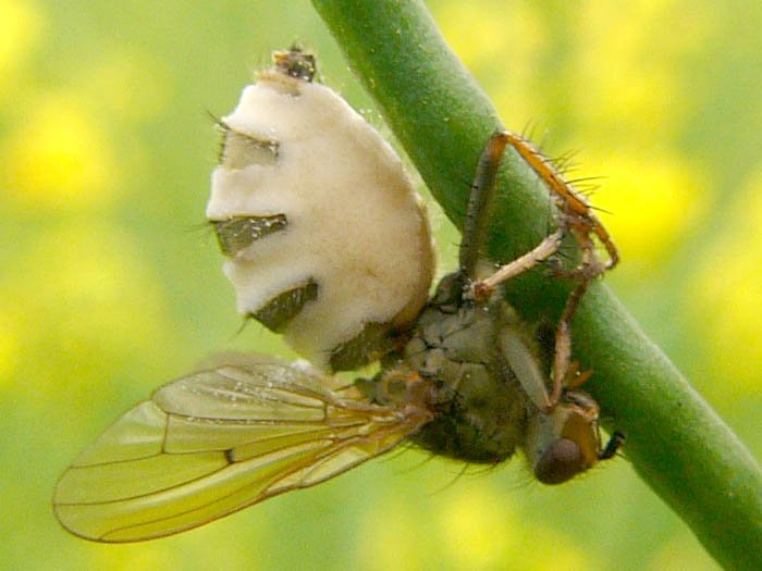 Parazitická houba hmyzomorka muší (Entomophthora muscae) vyvinula strategii k maximálnímu využití napadené mouchy. Prorůstáním do motorických center hmyzího mozku přiměje umírající mouchu, aby z posledních sil vylezla na nejvyšší místo v okolí. Spory houby tak mohou poletovat co nejdál. Pro lepší šíření navíc vypouští feromony, které přimějí prolétající samečky mít pohlavní styk mrtvým nositelem. Sami se tak nakazí a houba se může spokojeně šířit. Hmyzomorky mají řadu druhů, které si pochutnají na odlišných druzích hmyzu. Epidemie hmyzomorky opakovaně nabývá takového rozsahu, že hovoříme o muším moru. Andreas Naundrup provedl řadu analýz a zjistil, že houba na muších mrtvolách vyrábí složitou směs neobvyklých těkavých látek, které dohromady vytvářejí návnadu a smrtící muší afrodiziakum v jednom. Některé látky působí na větší vzdálenost a patrně mouchám připomínají pach potravy. Když nalákaní samci much přiletí blíž, jejich mysl ovládne zničující sexuální apetit.