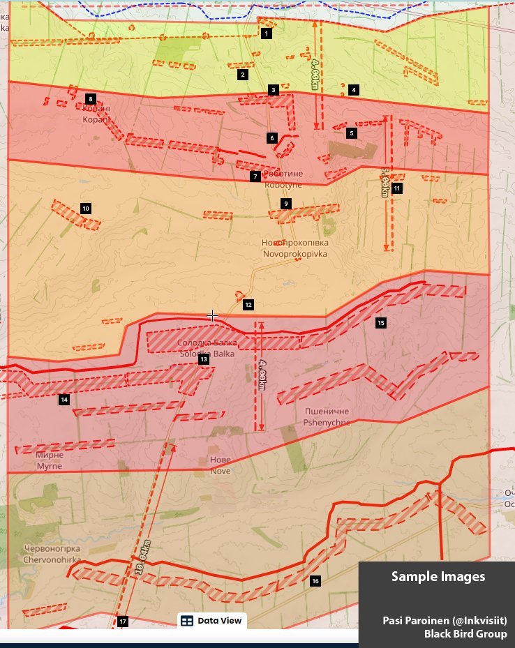 Momentálně se o ruském opevnění v Záporoží a jeho prolamování píše prakticky všude. Pro zajímavost si ukážeme propracovaný systém opevnění (patrně nějaký opěrný bod) severně od Novoprokopivky (13 km jižně od Orichiva). Nedávno o něj probíhaly boje a aktuálně už má být v rukou ukrajinské armády.