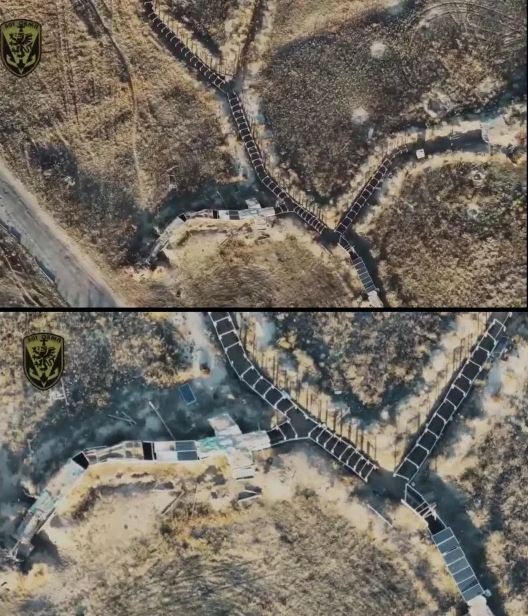Rusové se snaží vylepšit své zákopy kovovými rámy a různými stříškami, aby se chránili před FPV drony a zároveň skryli jakýkoli pohyb uvnitř zákopů. V odkazu je i video, jak ukrajinský FPV dron na takovouto pozici útočí - jen z ostřejšího úhlu.