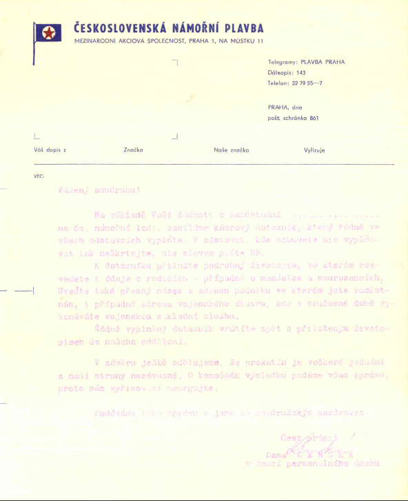 V závěru ještě sdělujeme, že pokud cestovní pas není vystaven, nemůžeme dát závzný příslib k Vašemu přijetí do ČNP, ani sdělit přibližný termín nalodění.