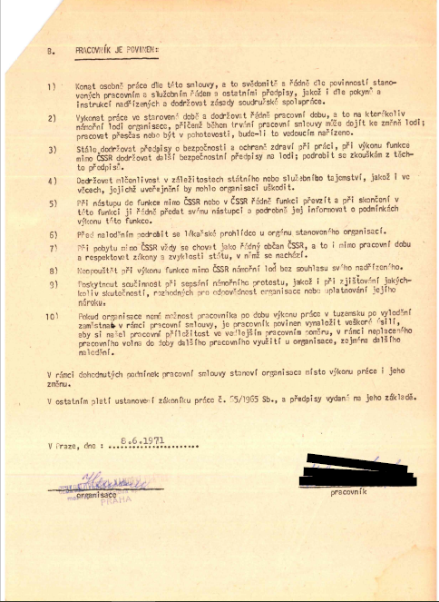 7/ Svůj nástup do podniku volte tak, abyste se mohl seznámi se základními povinnostmi a právy zaměstnance Československé námořní plavby a zařídit potřebné záležitosti jako: