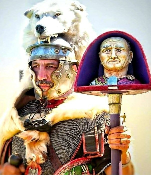 "Nejde o to kam jdeme, ale co s sebou si neseme." No tak asi tímto směrem uvažovali u římského vojska, kdy v legiích měli speciální hodnost - nosiče zpodobnění samotného Císaře (vlastně i boha v jedné osobě). "Imaginifer" nesl standartu se zpodobněním císaře, jako stálou připomínku věrnosti vojáků. Hodnost byla přidána do legií za vlády Augusta, spolu se založením císařského kultu. Základem byl trojrozměrný portrét vyrobený z tepaného kovu. Šlo o natolik vzácnou věc, že se jí mohla pyšnit pouze první kohorta. Zde na fotografii můžeme vidět rekonstrukci od švýcarského spolku "Legio XI Claudia". Škoda že se tato tradice nedochovala až do dnešních časů - tvář prezidenta by jistě "uklidnila" (srazila do bláta a pošlapala pýchu) nejednoho zpupného vojáka! Ideálně, pokud by měl v očích kamery a ukrytou tiskárnu k rozdávání pokut .))