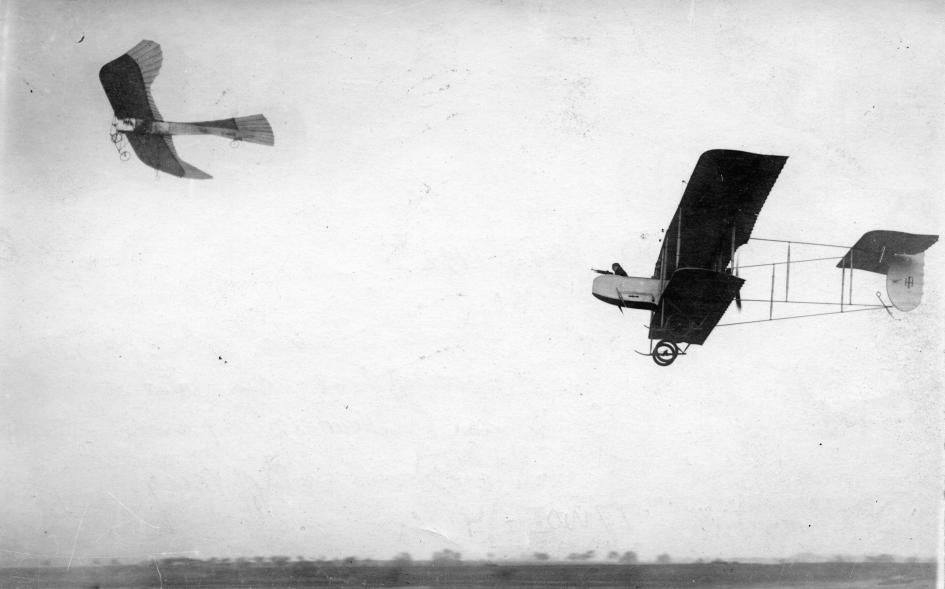 Německý pozorovací letoun Taube je pronásledován francouzským dvoumístným letounem Farman HF.20 (1914)