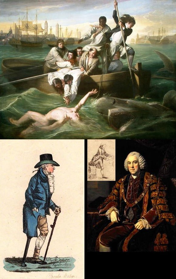 Autorem obrazu se žralokem je americký malíř John Singleton Copley (1738-1815). Dílo vzniklo roku 1778, leč ke skutečné události došlo roku 1749 v Havaně na Kubě. Čtrnáctiletý anglický sirotek Brook Watson (1735-1807), který sloužil jako člen posádky na obchodní lodi, se rozhodl zaplavat v tamním přístavu. Zde jej napadl žralok, napoprvé mu ukousl kus masa z levé nohy pod lýtkem, napodruhé mu ji ukousl v kotníku. Posádka malé lodi, která čekala jako doprovod na svého kapitána při cestě na břeh, žraloka zahnala a Brooka zachránila. Noha mu byla amputována pod kolenem a za tři měsíce se ze zranění zotavil. Následující roky sloužil jako vojenský komisař a účastnil se bojů o francouzskou pevnost Fort Beauséjour v Kanadě. Roku 1759 odešel do Londýna, kde se stal úspěšným obchodníkem a členem výboru Corporation of Lloyds. Před vypuknutím americké revoluce navštívil tamní kolonie a zachytil dopisy generála Thomase Gage, které údajně dokazovaly, že generál byl špiónem. V listopadu 1775 doprovázel Watson amerického vězně Ethana Allena na cestě z Kanady do Anglie. Allen napsal, že byl dán na milost zlomyslného a krutého anglického obchodníka z Londýna, který se jmenoval Brook Watson. V roce 1782 působil jako generální komisař pro armádu v Severní Americe, které velel sir Guy Carleton. Vojenské funkce schopně kombinoval s politickou kariérou, díky čemuž působil jako konšel Londýna a člen parlamentu. Z Brooka Watsona se stal Sir Brook Watson, 1. baronet Watson, ředitel Bank of England a roku 1796 Lord Mayor of London (starosta Londýna).