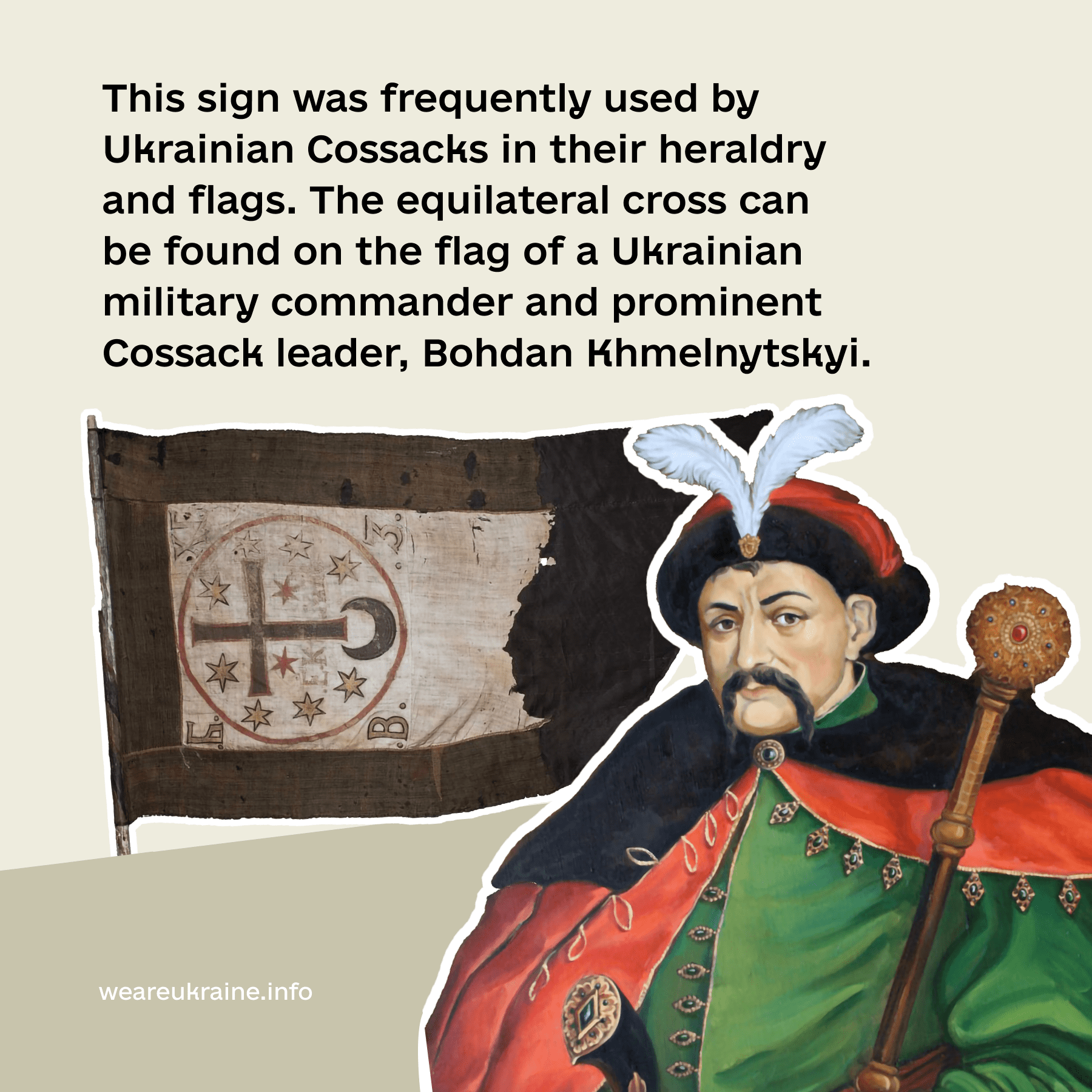 Ty kříže jsou samozřejmě mnohem starší, začaly se objevovat v 16.st, jde o jeden ze symbolů Záporožského vojska, konkrétně prapor na obrázku s bevkem je Černihovského pluku, r. 1651 jej v bitvě u Lojeva, kdy mu velel Martin Nebaba (v bitvě proti polské přesile padl) ukořostil kníže Radziwil, dnes je(jako jeden z mnoha, např. třeba i ten na obrázku s B. Chmelnickým) v muzeu ve Stockholmu. Kozácký kříž byl používán i na Záporožských pečetích, erbech a praporech jednotlivých kureňů, pluků, na náhrobních kamenech.