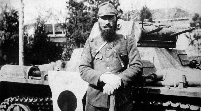 Voják japonské armády před ukořistěným čínským tankem německé výroby Pz.Kpfw.I Ausf.A. od 3. čínského obrněného praporu (byl vyzbrojen 10 německými tanky tohoto typu).