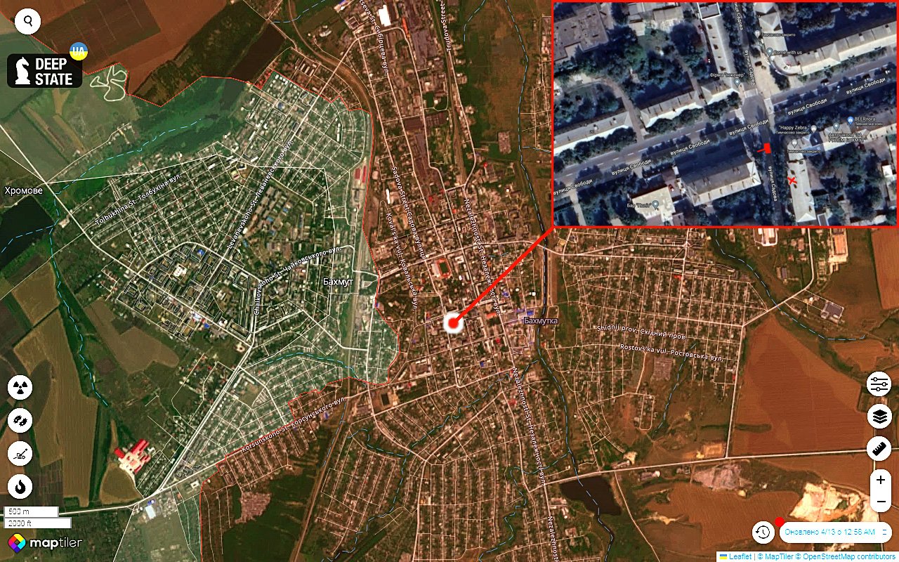 Ruský T-90M v Bachmutu - docela zajímavě vymazlený. Podle geolokace jde o křižovatku Svoboda a Sadovaya u Bachmutské kavárny.