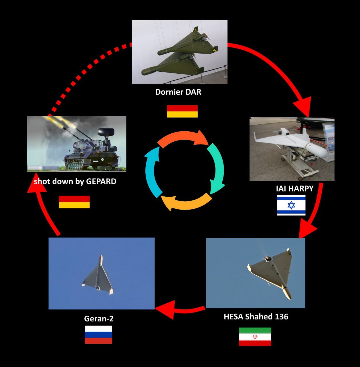 Stejně jako pozdější ruský dron Geran-2, má totiž původ ve starém německém protiradarovém dronu DAR (Die Drohne Antiradar), který se později proměnil v úspěšný izraelský IAI Harpy. Historie dronu DAR je docela zajímavá a stojí za to se do tématu ponořit blíže. V polovině 80. let zahájily Německo a USA společný projekt zaměřený na vytvoření specializovaného jednorázového bezpilotního prostředku, který by byl schopen zaměřovat sovětské radary, stát se návnadou odvracející nepřátelskou PVO od skutečných zbraní nebo zcela vymazat protiletadlové systémy. To vše bez nutnosti dalších zásahů operátora po startu. Vítězem soutěže o zakázku vyšel německý výrobce letadel Dornier (existoval v letech 1922–2002), jejich produkt byl znám jako "Die Drohne Antiradar", do výrobního procesu byly implementovány i některé technologie vyvinuté společností Texas Instruments. Podle veřejně dostupných údajů byl DAR létající sebevražedný dron s hmotností 110 kg, maximální rychlostí 250 km/h, délkou letu až 3 hodiny, potenciální dolet by se tedy měl pohybovat kolem 600 km. Motor dodaly Fichtel a Sachs, které nyní vyrábí výhradně motory pro automobily. Dron měl startovat ze speciálního náklaďáku na podvozku MAN 22.240DE, který mohl nést až šest těchto prostředků, ačkoli prototypy byly původně vypuštěny z Iveca 260AH. V podstatě tak šlo o stejný koncept jako později použili Íránci při jejich dronu Šahed-136. DAR měl vstoupit do služby u německého Bundeswehru v 90. letech, ale Studená válka skončila a protivník pro DAR přestal existovat. Poté se stopy tohoto projektu ztrácí v čase. Několik těchto dronů je vystaveno ve vojenském muzeu Dornieru. Existuje tvrzení, že všechny dva prototypy nosných raket byly v roce 2009 prodány neznámému zákazníkovi. Jak velká část projektu DAR se později proměnila v IAI Harpy nebo v Šahed-136/131 není úplně jasné. Faktem ale zůstává, že tento americko-německý projekt se stal počátkem moderních antiradarových dronů.