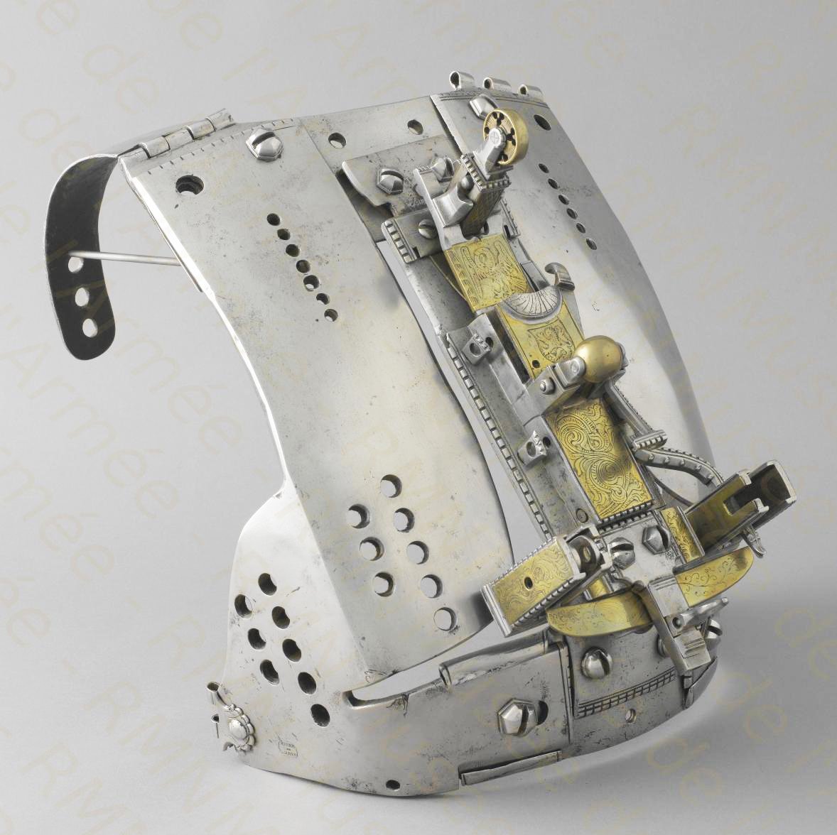 Mechanický kyrys pro turnaj, který se konal na oslavu svatby císaře Maxmiliána I. Habsburského s Biancou Marií Sforza roku 1493. Vážil 6,95 kilo a vyrobil jej slavný zbrojíř Lorenz Helmschmied (1450-1515) z Augsburgu. Nyní je k vidění v Musée de l'Armée v Paříži. Tento typ kyrysu se používal při specifickém druhu turnaje nazvaném Geschifttartschenrennen, kdy diváci mohli okamžitě vidět, že byl jezdec zasažen, jelikož při dobrém zásahu od něj štít doslova vylétl. Samotný mechanismus je velice zajímavý. Zmiňuje se, že měl pouze držet štít na místě a vertikálnímu vyhození došlo tak, že dřevec zasáhl štít a vysunul jej nahoru. K tomu sloužily ony otočné válečky. David Edge v knize Arms and Armor of the Medieval Knight poznamenává, že minimálně v jednom případě byl celý mechanismus osazený napnutou pružinou. Ta ale neměla štít vymrštit vzhůru, ale "vybouchnout" jednotlivé segmenty štítu do stran. Ona pružina tak v podstatě přidala celé "šou" na dramatičnosti. Pro obecenstvo to musela být vskutku úžasná podívaná.