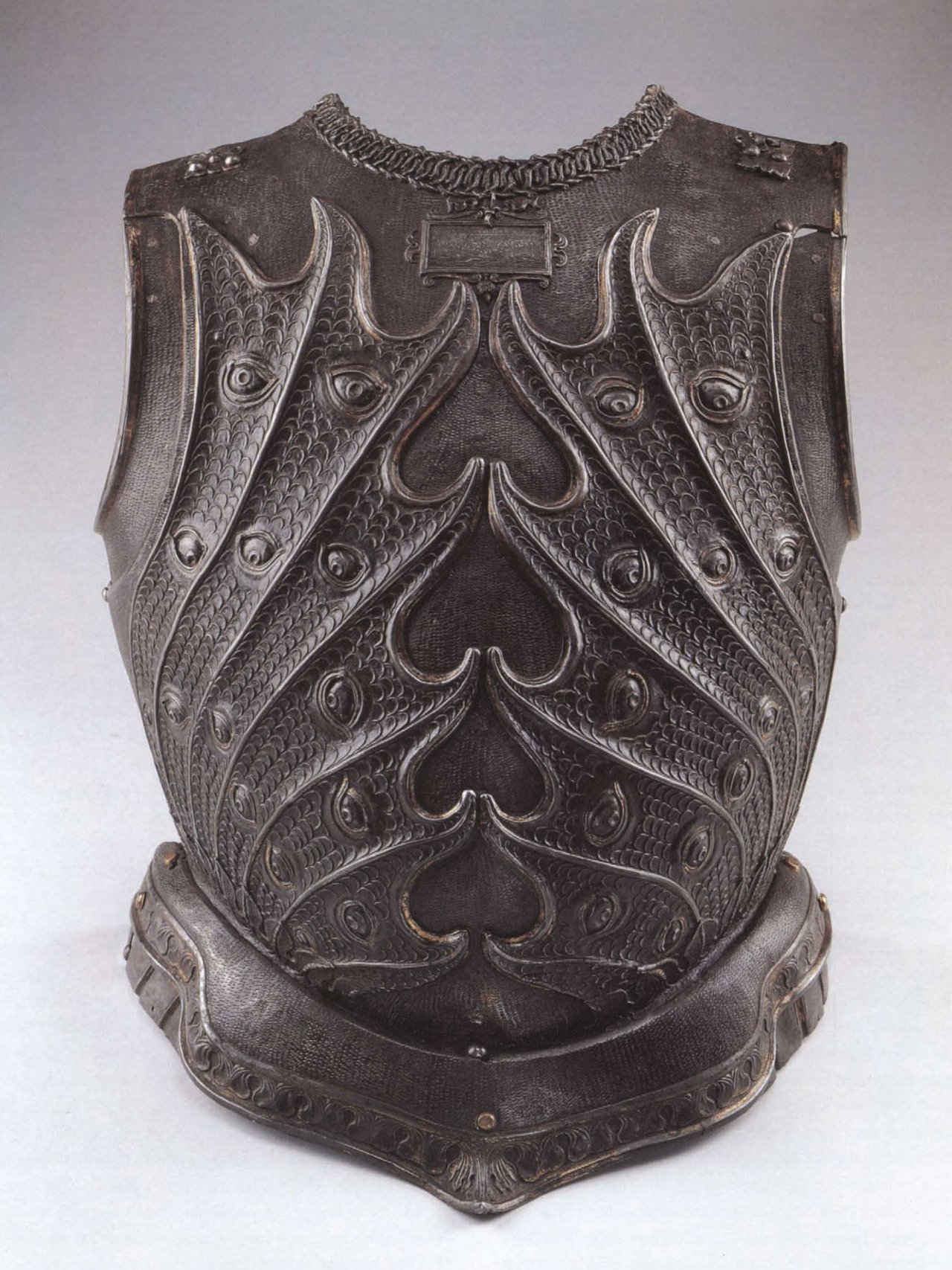 Jeden z největších zbrojířů všech dob Filippo Negroli (1510-1579) se stal mistrem v navrhování zbrojí a dosáhl pověsti nejlepšího dekoratéra své doby. Na kyrysu je vytepán symetrický pár šupinatých křídel doplněný množstvím humanoidních očí. Jde o součást legendární "dračí zbroje", kterou můžeme vidět i na dobových rytinách a mnoho jejich částí se dochovalo až do dnešních časů. Guidobald II. della Rovere (1514-1574) následoval svého zavražděného otce Francesca Maria I ve funkci vévody z Urbina od roku 1538 až do své smrti v roce 1574. Byl členem rodu La Rovere. Guidobaldo byl významným mecenášem umění obecně a zvláště podporoval Tiziana. V roce 1535 se i přes papežský zákaz oženil s Giulií da Varano, dcerou vévody z Camerina. Téhož roku jej tedy papež Pavel III. exkomunikoval a později na něj uvrhl klatbu. V roce 1546 se stal (tak jako jeho otec) velitelem nájemných vojsk (kondotiérem) Benátské republiky. Zaměstnával umělce a zbrojíře Bartolomea Campiho, který mu vyrobil jednu z jeho zbrojí. Rok po smrti manželky se roku 1548 oženil s Vittorií Farnese - dcerou Piera Luigi Farnese, vévody z Parmy a Gerolamy Orsini, dcerou Lodovica Orsiniho a manželky a první sestřenice Giulie Conti. Později byl jmenován papežským guvernérem Fana, obdržel také titul vrchního velitele (capitano generale) papežských států a také titul prefekta Říma. V roce 1559 byl najat španělským králem, aby pomáhal Bernardu Sanseverinovi (který se oženil s Isabellou, jednou z Guidobaldových dcer) ve válce proti osmanským Turkům. Prvního ledna 1573 se proti němu v Urbinu zvedla vzpoura kvůli nadměrným daním, načež ji nechal krvavě potlačit. Guidobald II. della Rovere zemřel 28. září 1574 v Pesaru, bylo mu 60 let.
