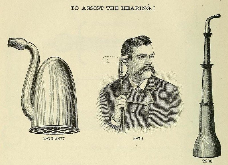 jedná se o čistě akustická zařízení, která mají podobu jednoduché obrácené trumpety a zvuk zesilují pasivně. První patent na zakřivená naslouchátka k nasazování za ucho a zesilující venkovní zvuk získal v roce 1836 Angličan Alfons William Webster. V roce 1880 pak získávají patent k dalším vylepšeným verzím naslouchadla Američané M.G. Foster a Francis D. Clarke. Miller Reese Hutchinson, který v roce 1902 upravil sluchadlo do přenosné formy poháněné bateriemi a nazval jej Acousticon, tak vynalezl předchůdce elektroakustického naslouchátka v dnešní podobě.